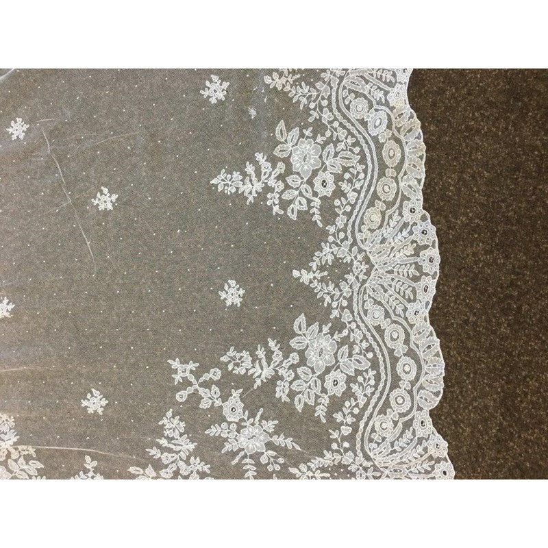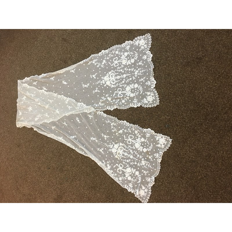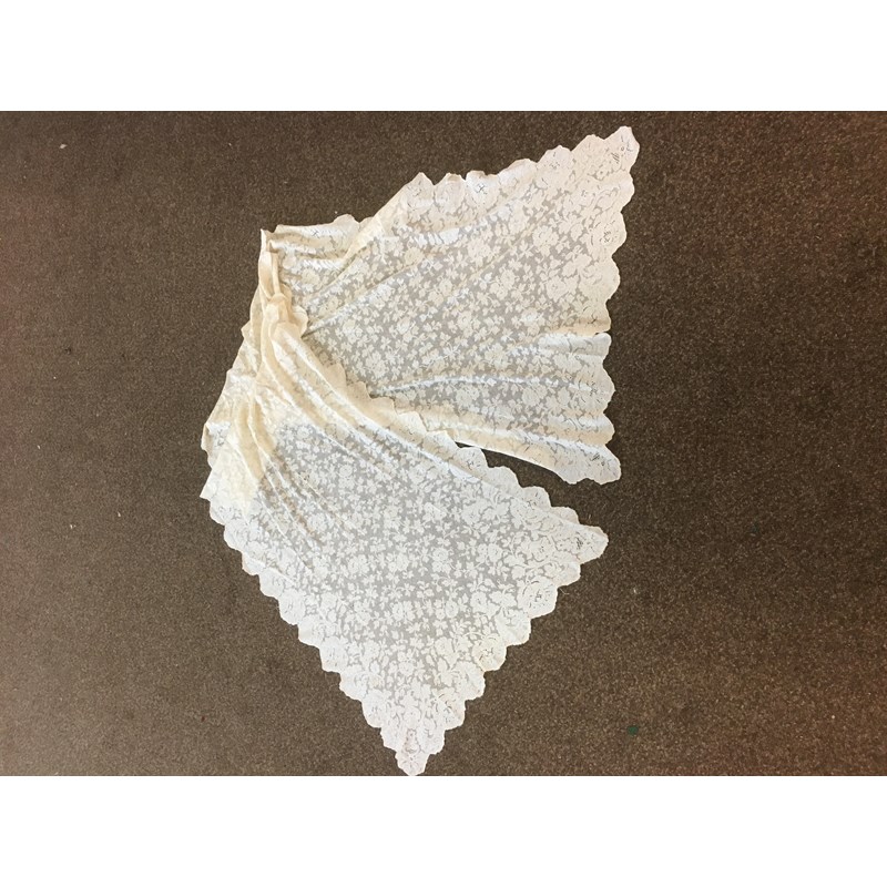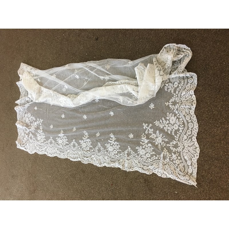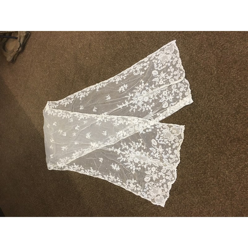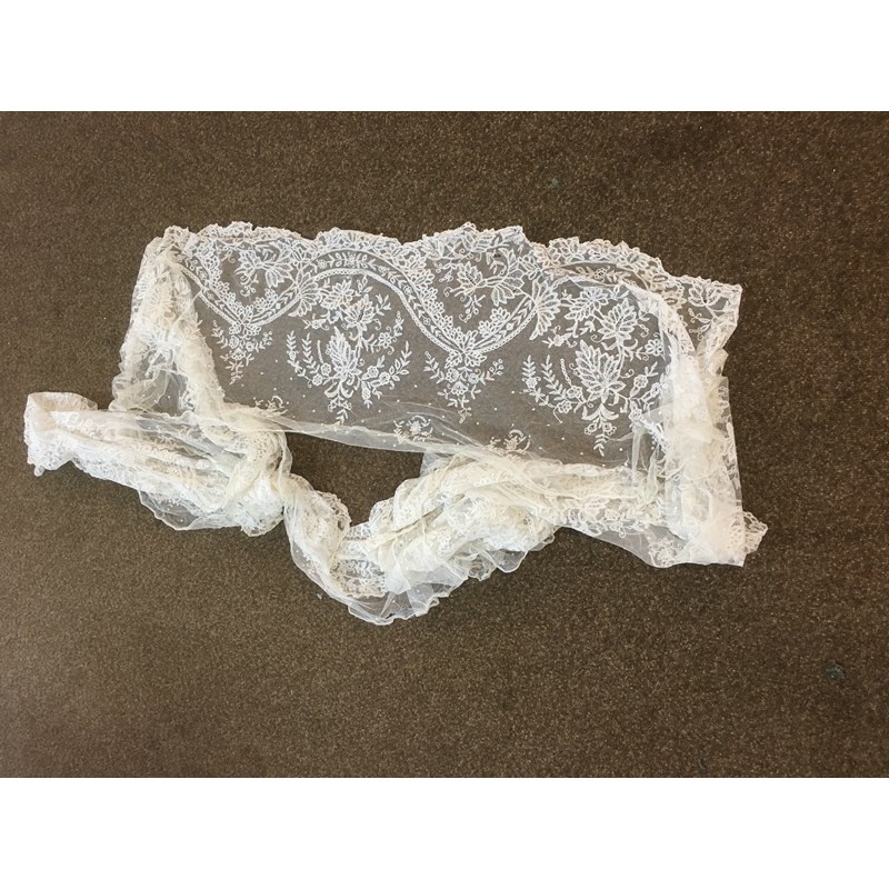 a collection of late 19th and early 20thc lace, to include a 19thc white applique lace veil, a flounce (or hem) of applique lace, two lace stoles, a lace edged net cap, a lace collar, a cream lace shawl, and assorted small lace items.