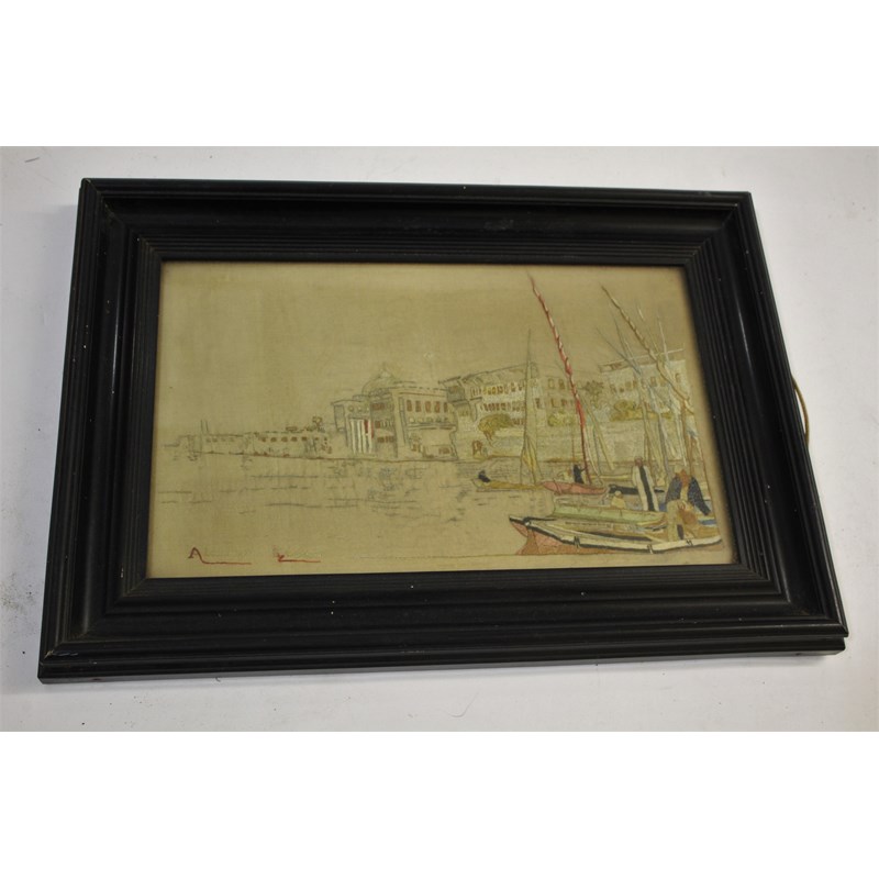 an embroidered panel of a scene in Alexandria, signed by W Street and mounted in an ebonised frame. Also with 2 framed embroideries on silk with scenes from Arabian Nights, also made by W Street and with prize labels on the backs, a wooden tray with framed embroidery, and various loose silk and embroidered panels, also made by the same man. Alexandria 31.5cms by 19.5cms