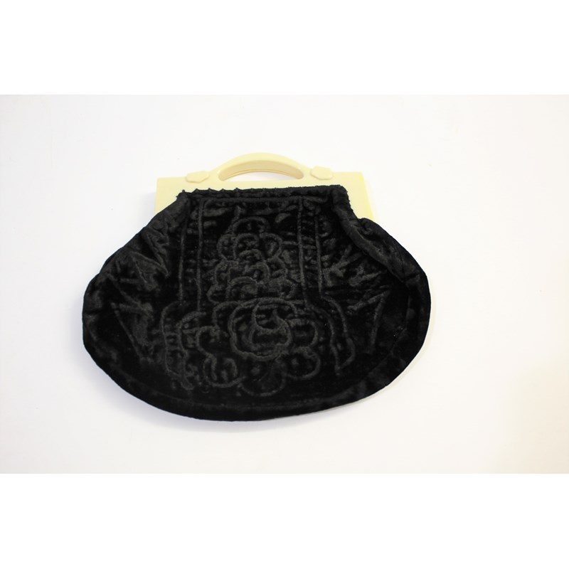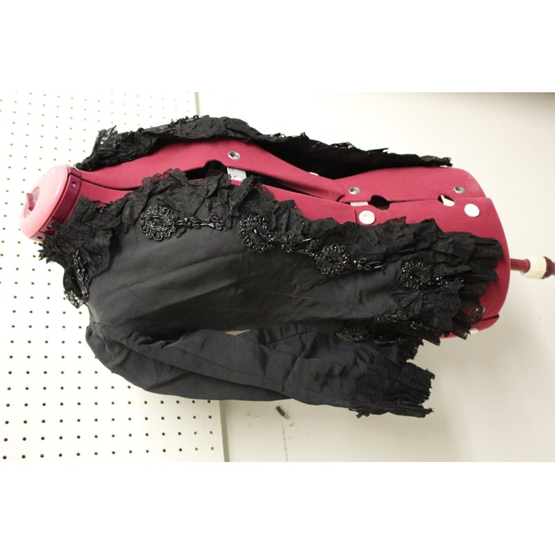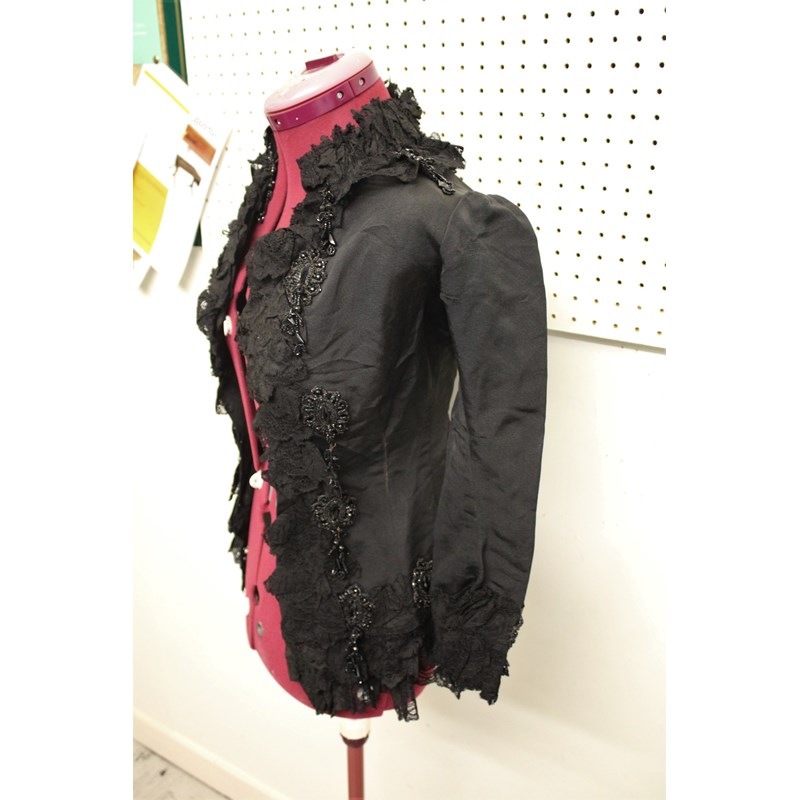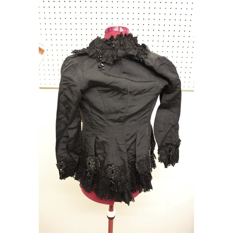 19THC JACKET a black grosgrain jacket embellished with lace and bead embroidered motifs, by Cole Brothers, Sheffield. Also with an early 20thc black velvet bag with cream plastic clasp. Jacket 65cms high. (2)