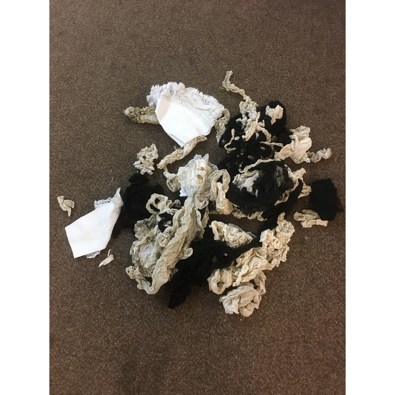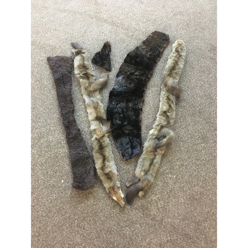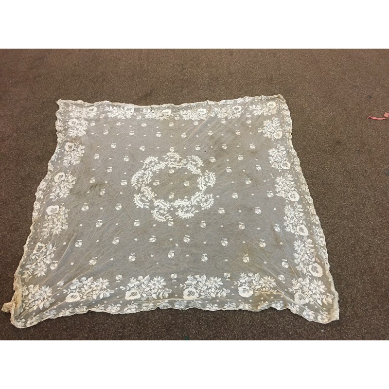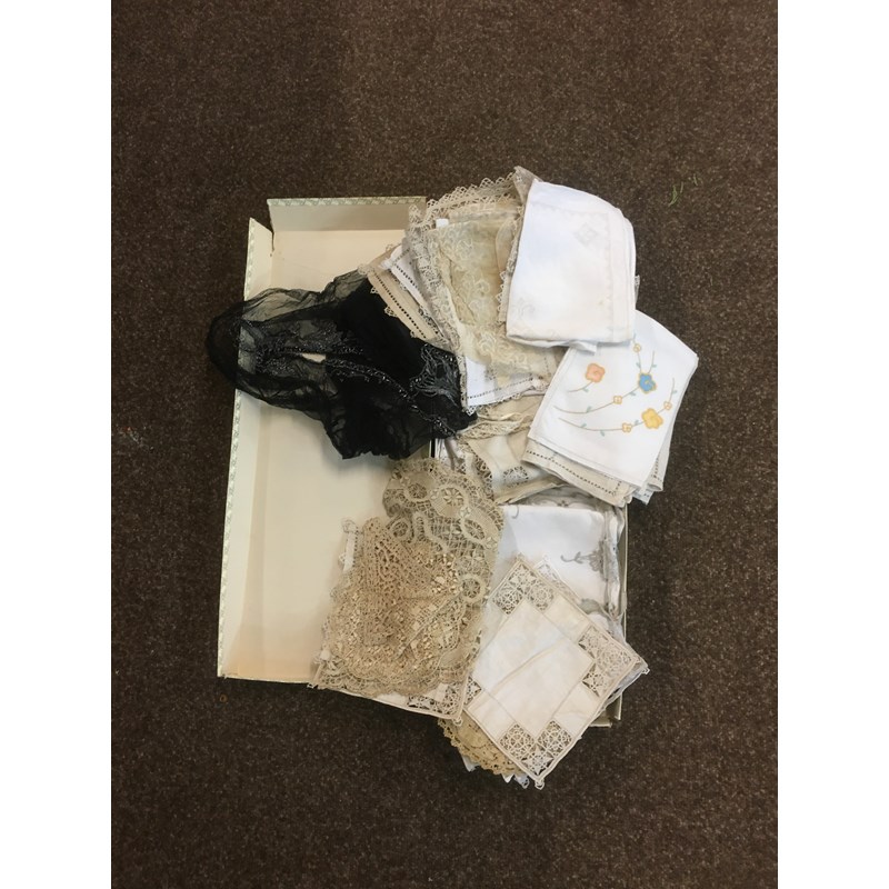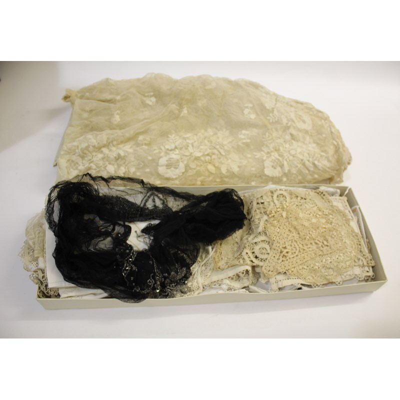 a mixed lot including a 19thc cream lace shawl, a qty of edgings, trimmings and off cuts, an early 20thc black net bodice trimmed with silver coloured bead decoration, a qty of linen and lace edged mats, a fur stole, and similar fur items.