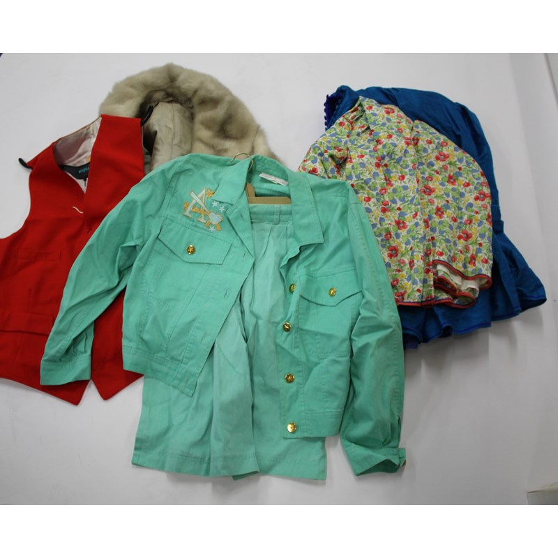 including a 1950's Simpson of Piccadilly green velvet coat, a pale mink stole, a Swaine & Adeney red pure wool waistcoat, an early 1980's Liberty print Anna Belinda dress, 1980's Anna Belinda turquoise silk ball gown with matching bag and shoes, and a green cotton Avantgarde jacket and matching shorts.