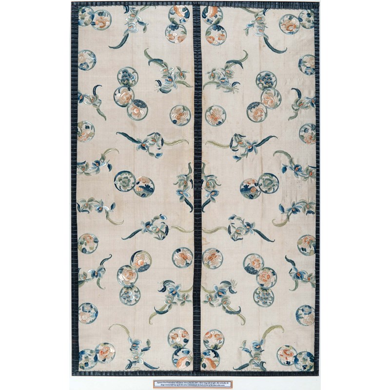 a pair of framed silk sleeves from a Kimono, embroidered with flowers and mounted in a frame. Probably late 19thc, with a small label inside with information. Sleeves 80cms by 26cms, Frame 96cms by 76cms
