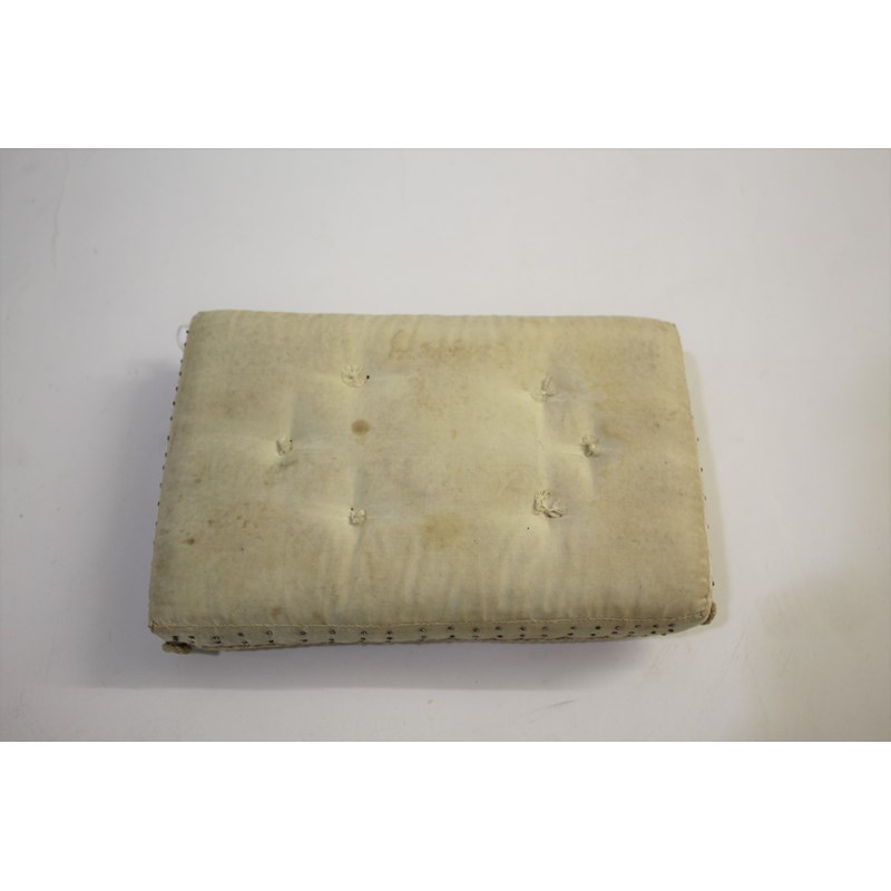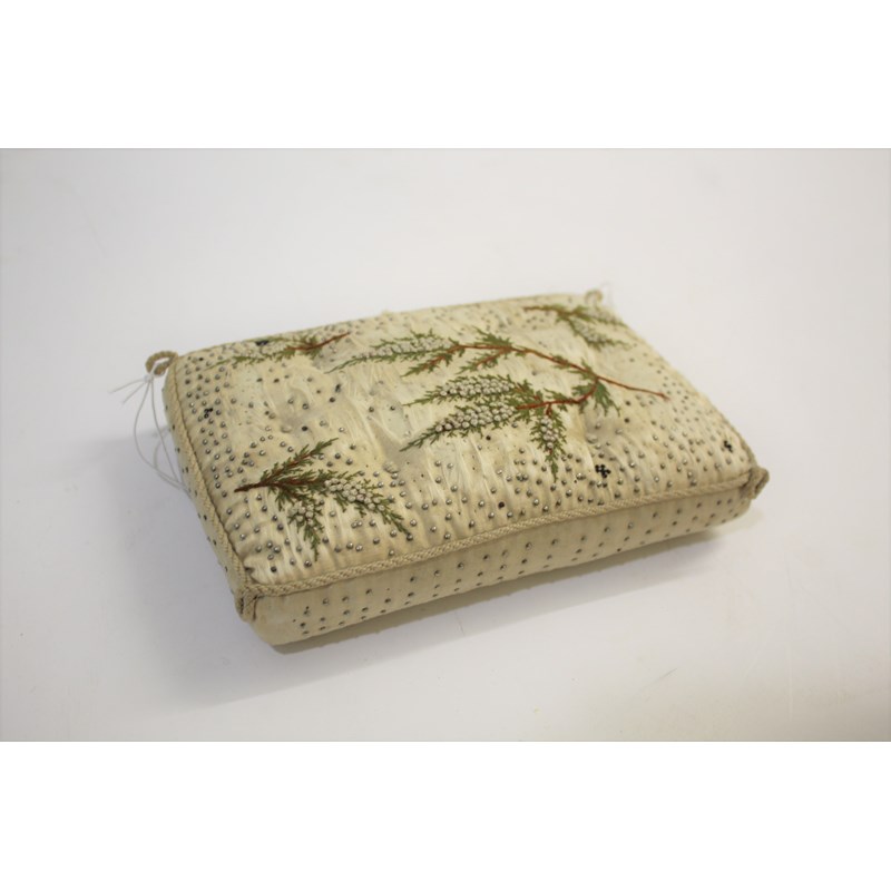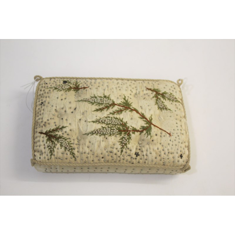 19THC PIN CUSHION an interesting early 19thc cream silk pin cushion, embroidered with white heather flowers. Possibly made as a Christening gift or love token. 20cms by 13cms