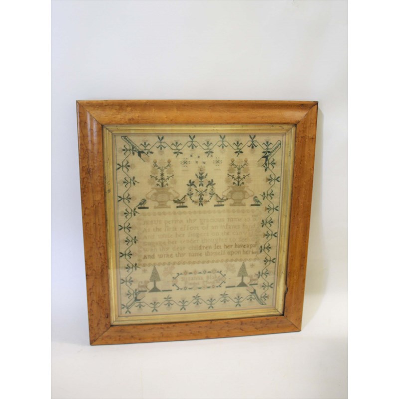 the sampler embroidered with a verse in the centre, with a border of flowers and Birds. Marked under the verse, Susanna Blake, Finished March 28, 1828, mounted in a maple frame and with the remains of an original frame label on the back (S Jennings, Carver and Gilder). Sampler 38cms by 34cms
