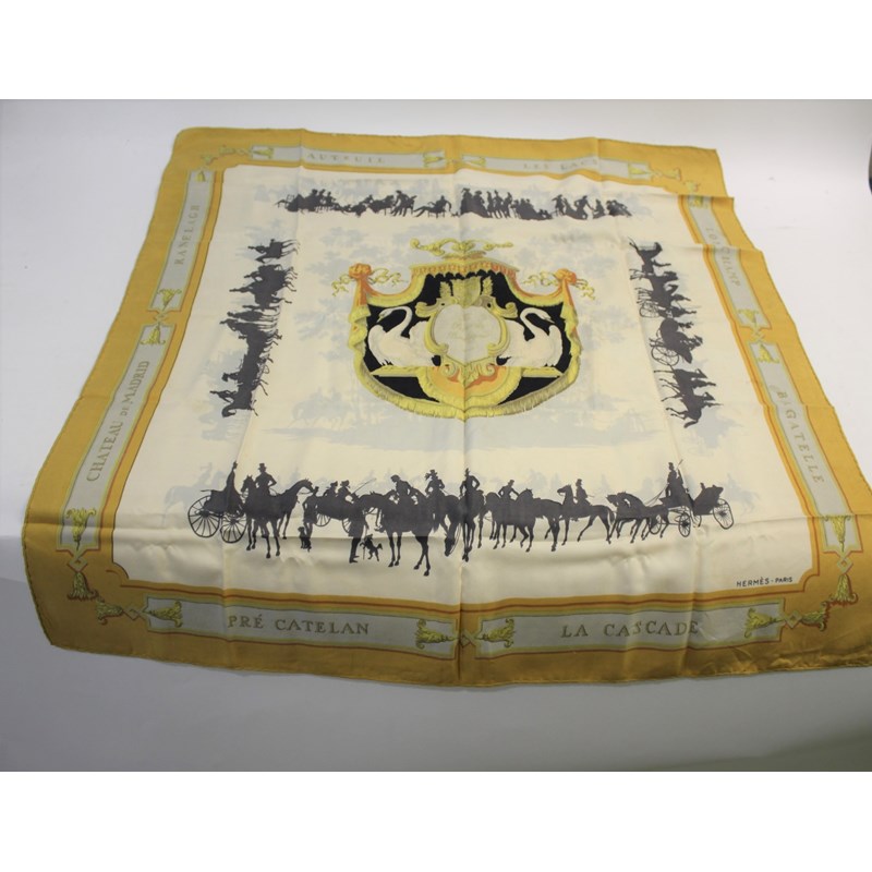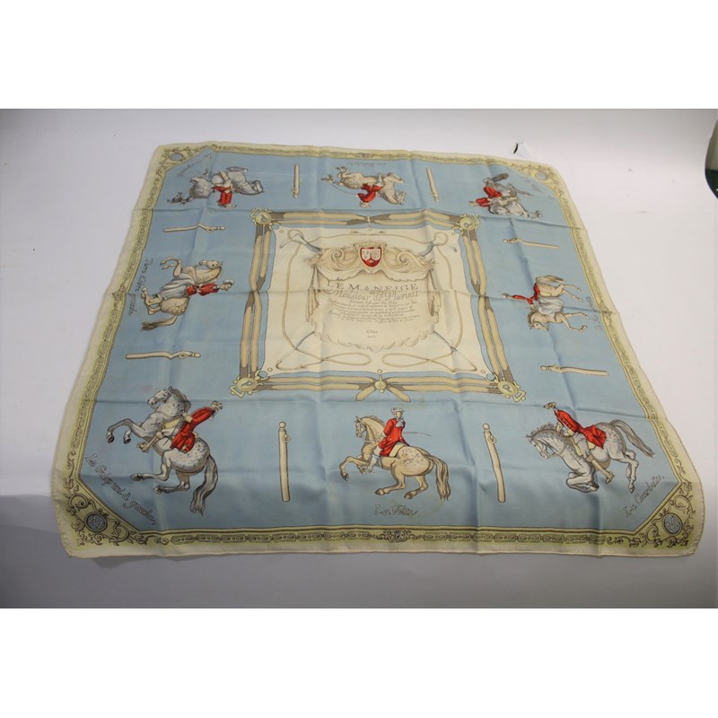 HERMES SCARF including a Hermes Bois de Bologne silk scarf (81cms by 86cms) and a French silk scarf titled Le Maneige (74cms by 76cms). (2)