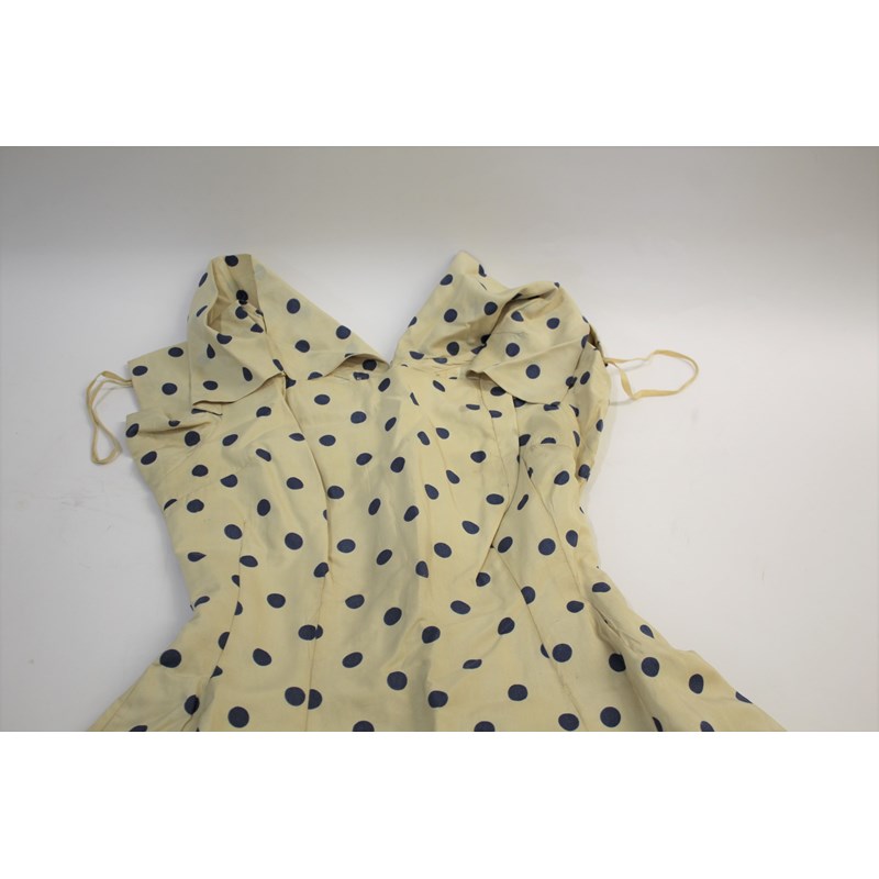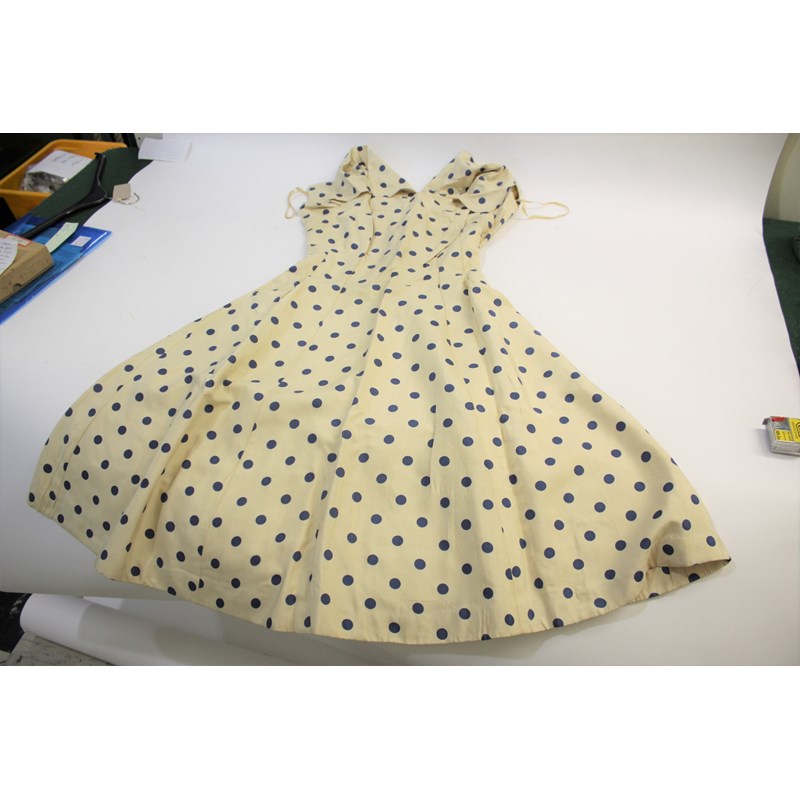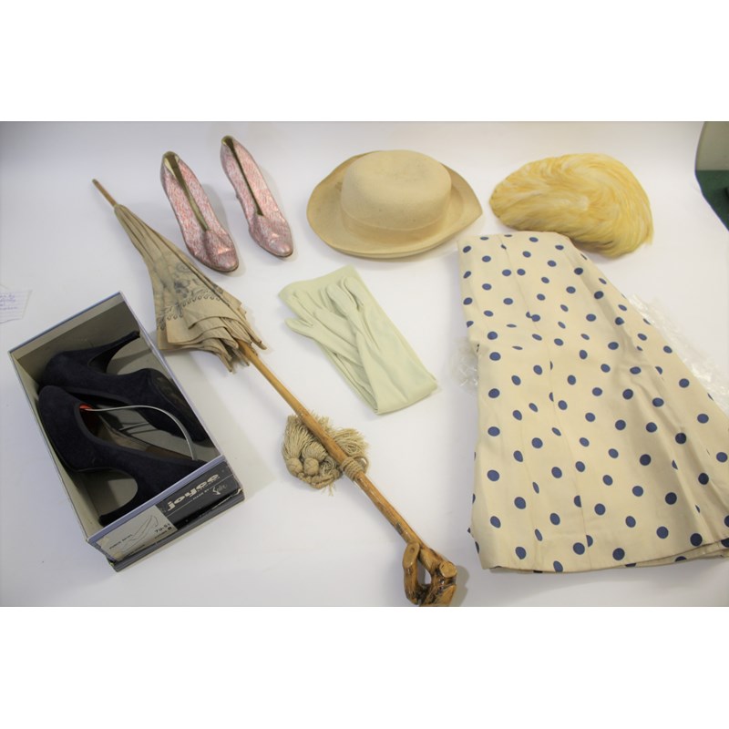 including a early 20thc cream silk parasol decorated with pale grey flowers, a pair of late 1920's pink and silver evening shoes by Randall's of London, a 1940's straw panama school hat, a 1950's cream feather hat, a cream silk dress with navy blue spots, a pair of pale green gloves, and a pair of navy blue court shoes (Saxone, Oxford St, Super Step De-Luxe).