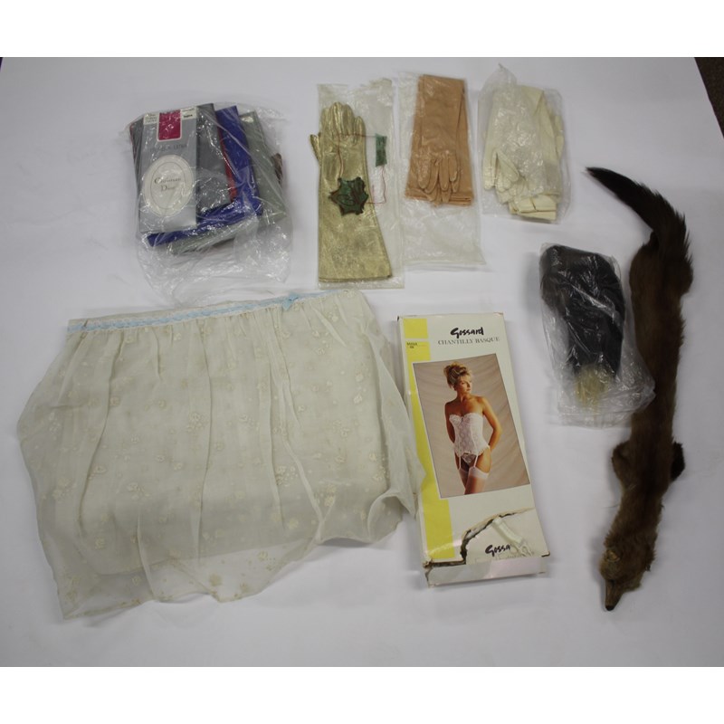 including a qty of early 20thc linens, a cream wool petticoat with embroidered decoration to the hem, a black full length skirt with lace inserts, a 19thc white cotton nightdress, a white marcella waistcoat, 1940's fur tippetts, a 1950's satin 3/4 length cocktail dress with sequin decoration, a 1950's full length petticoat skirt, vintage gloves, and other items.