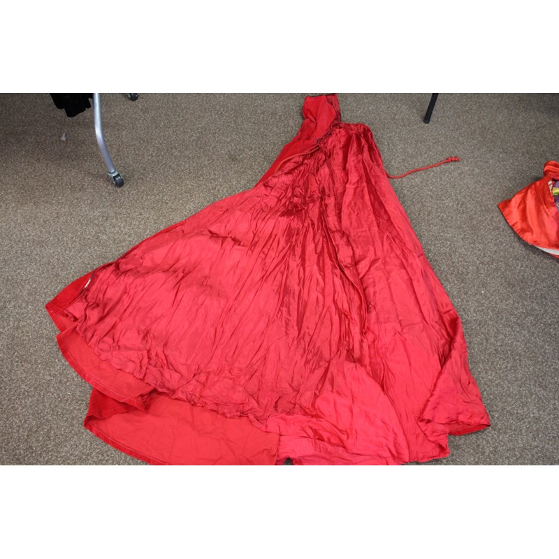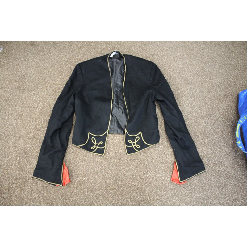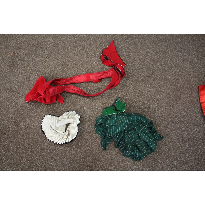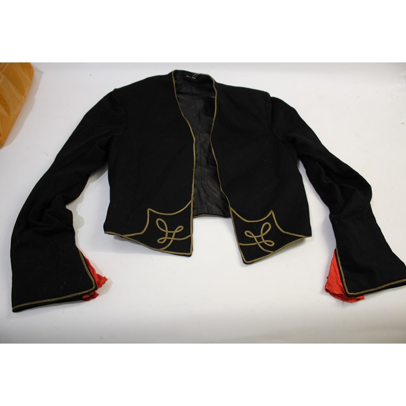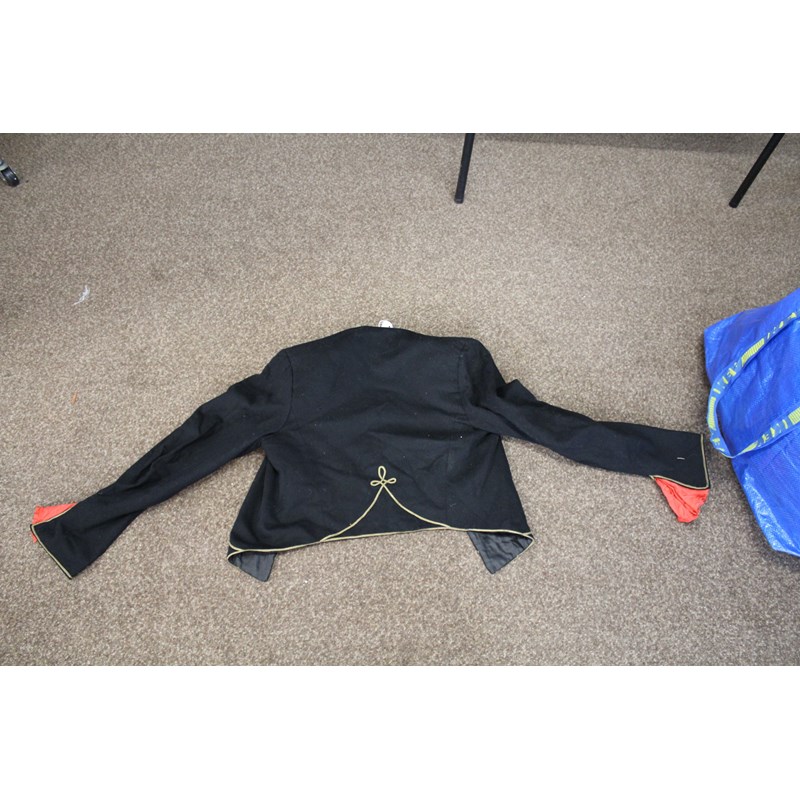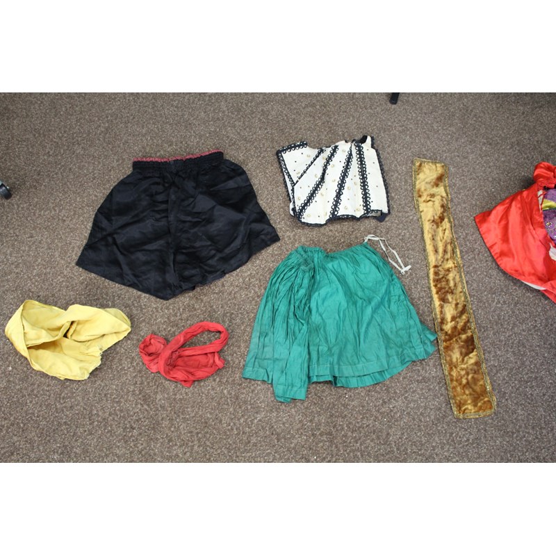 including a pair of black trousers (label for W Clarkson, London), a black embroidered jacket, a large red cord robe, a silk jacket embroidered with flowers, and various other vintage costume.