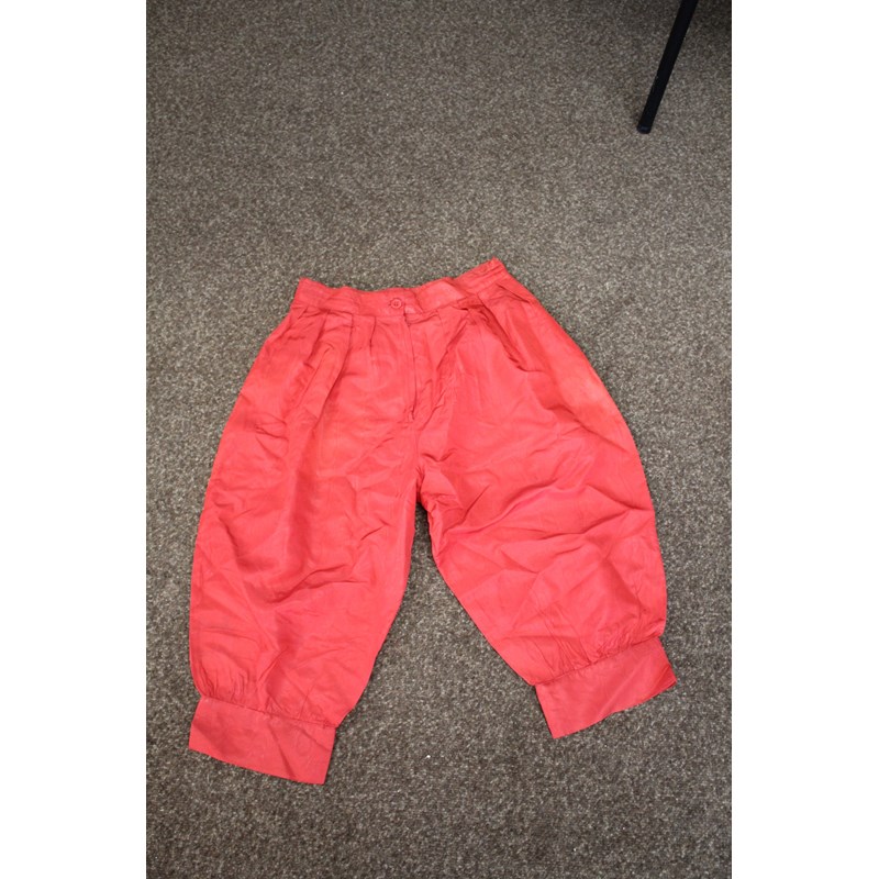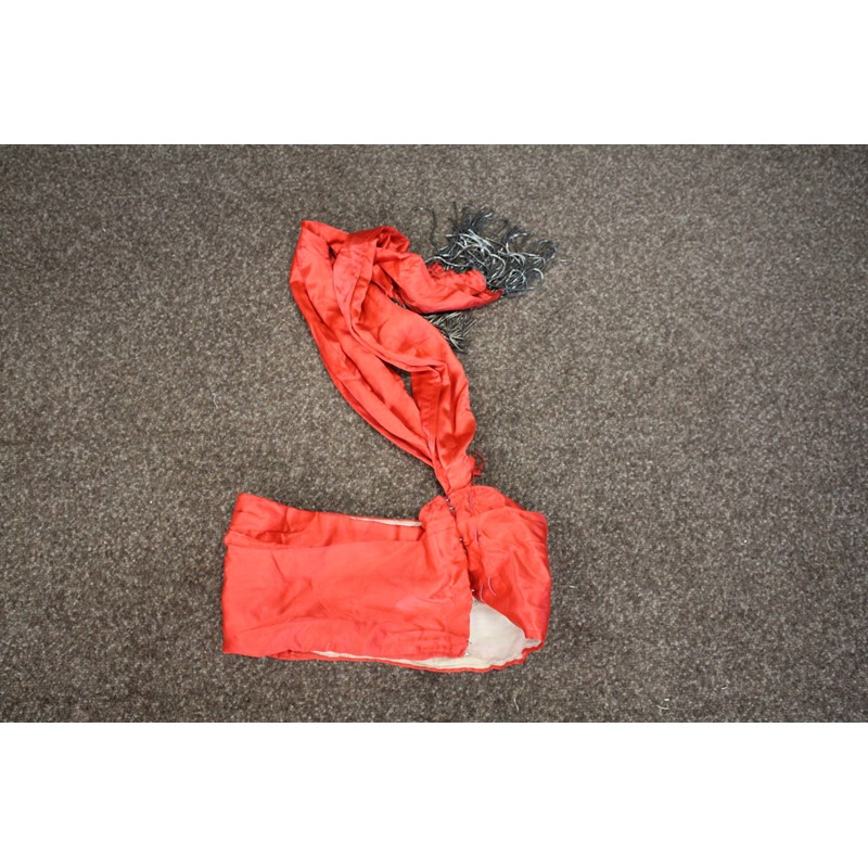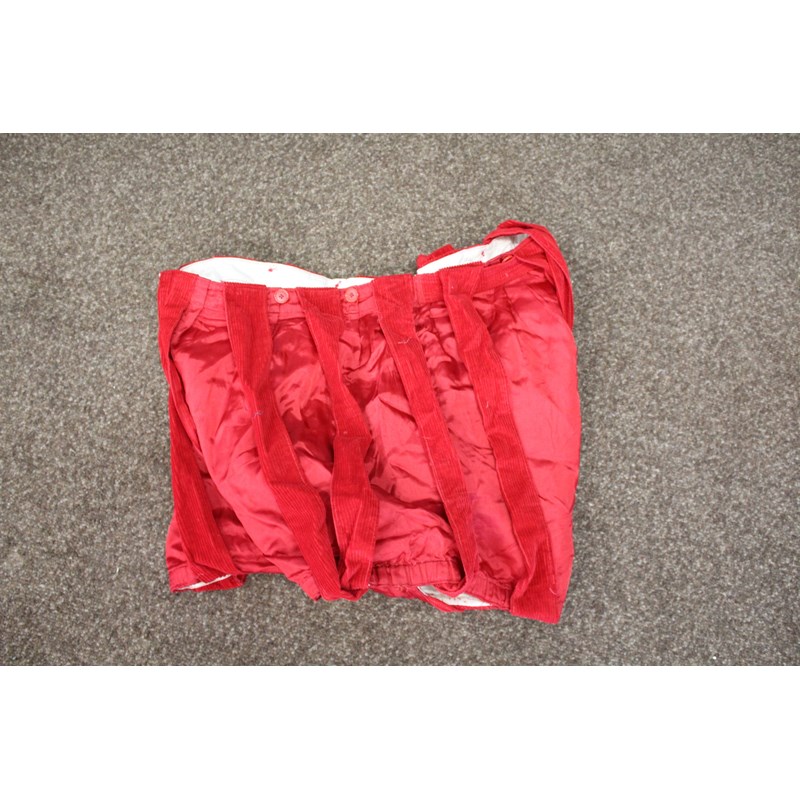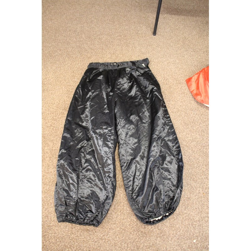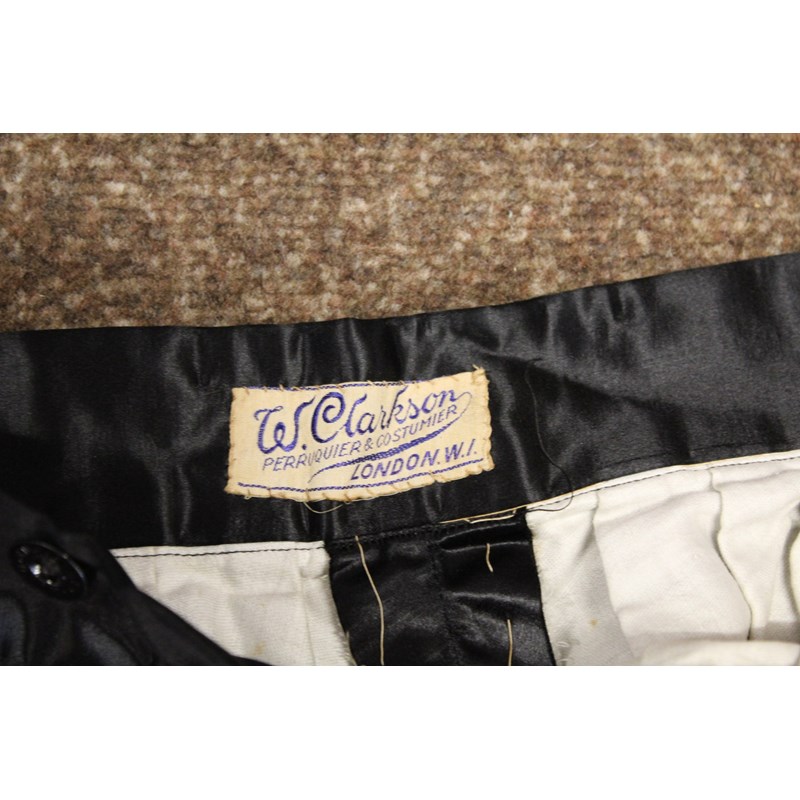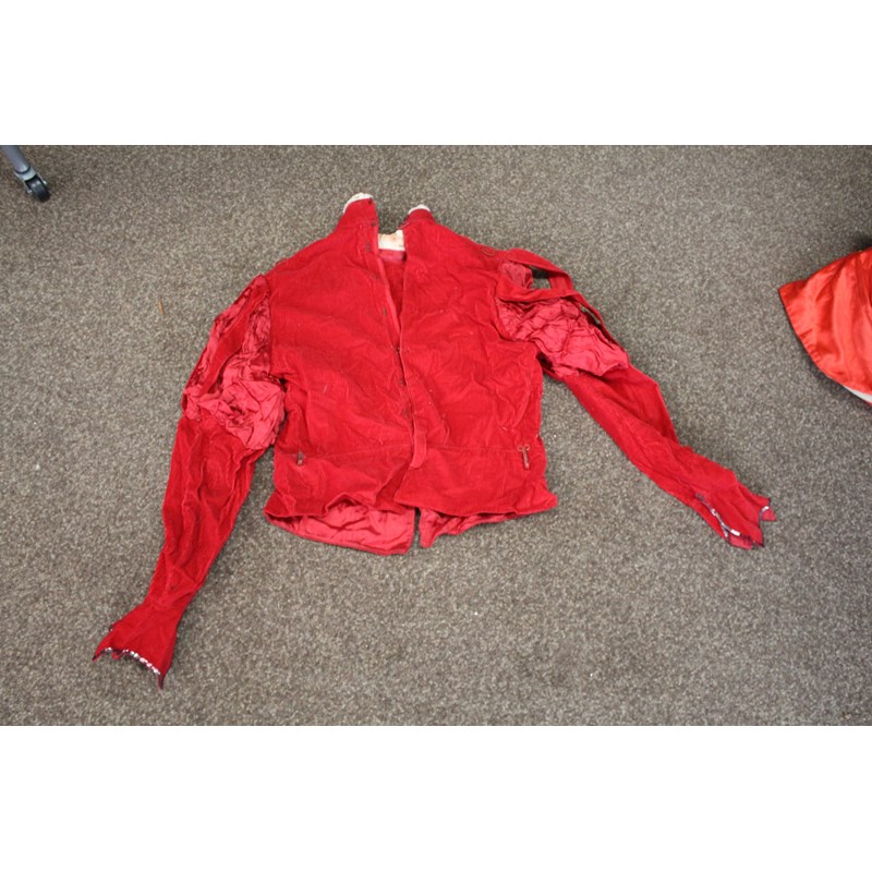 including a pair of black trousers (label for W Clarkson, London), a black embroidered jacket, a large red cord robe, a silk jacket embroidered with flowers, and various other vintage costume.