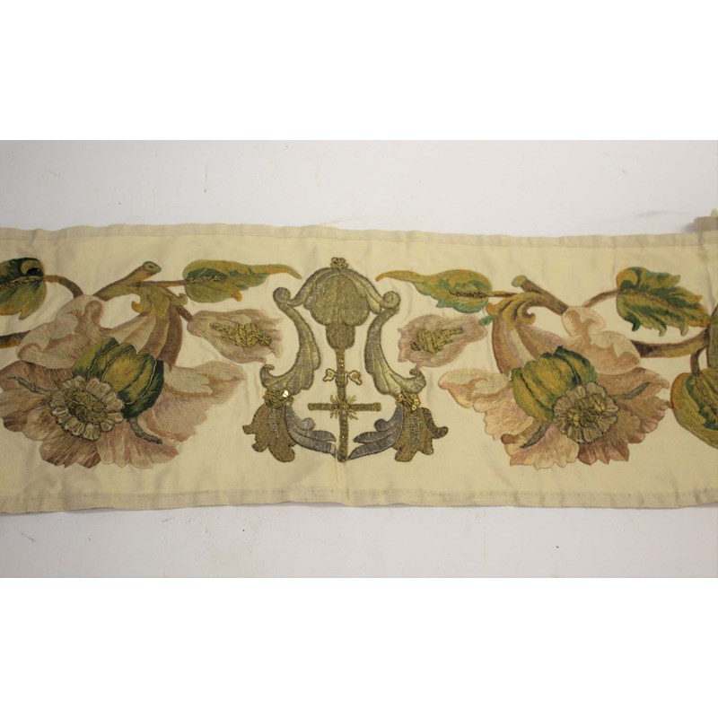 the cream silk decorated with embroidered and applique flowers and leaves worked in subtle shades of pink, green, brown and gold. With a central religious motif of embroidered gold and silver metallic thread. Length 2.4m by 24cms