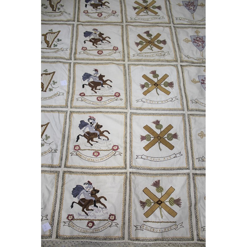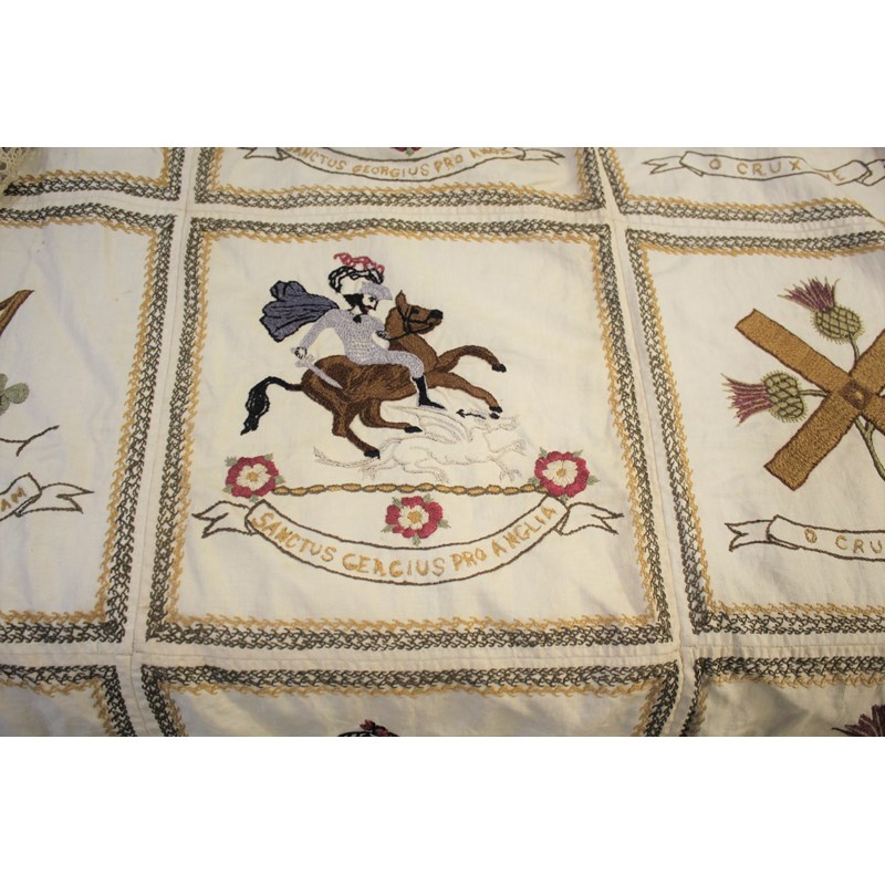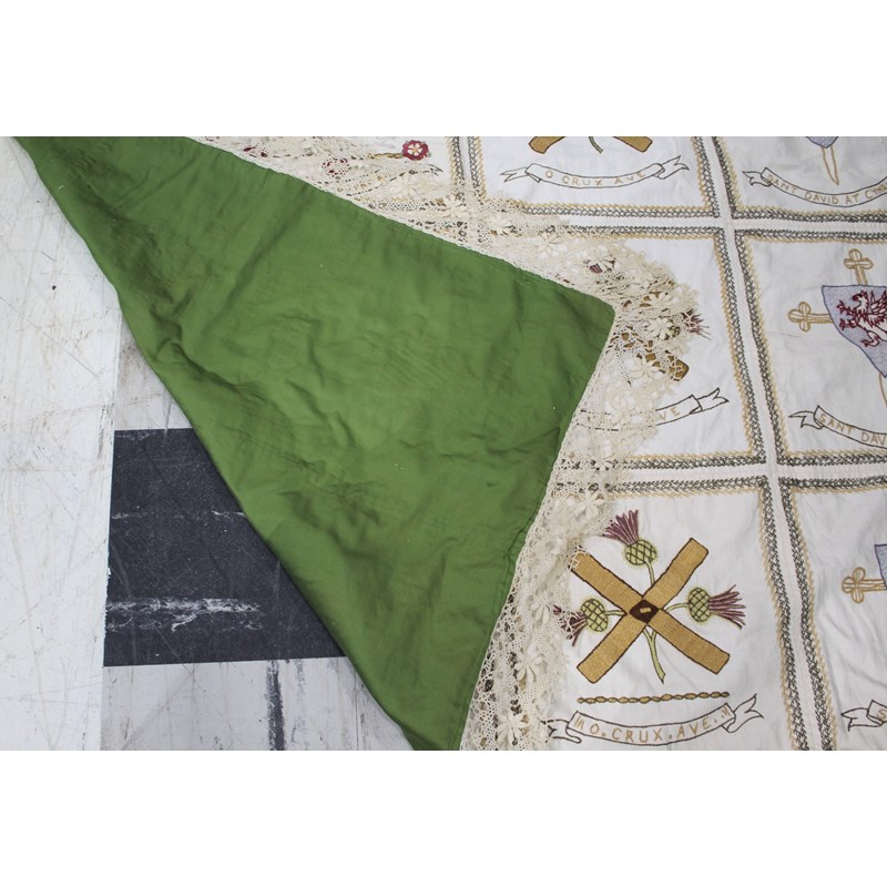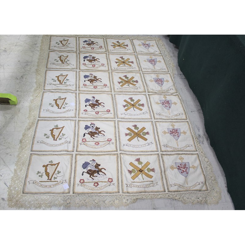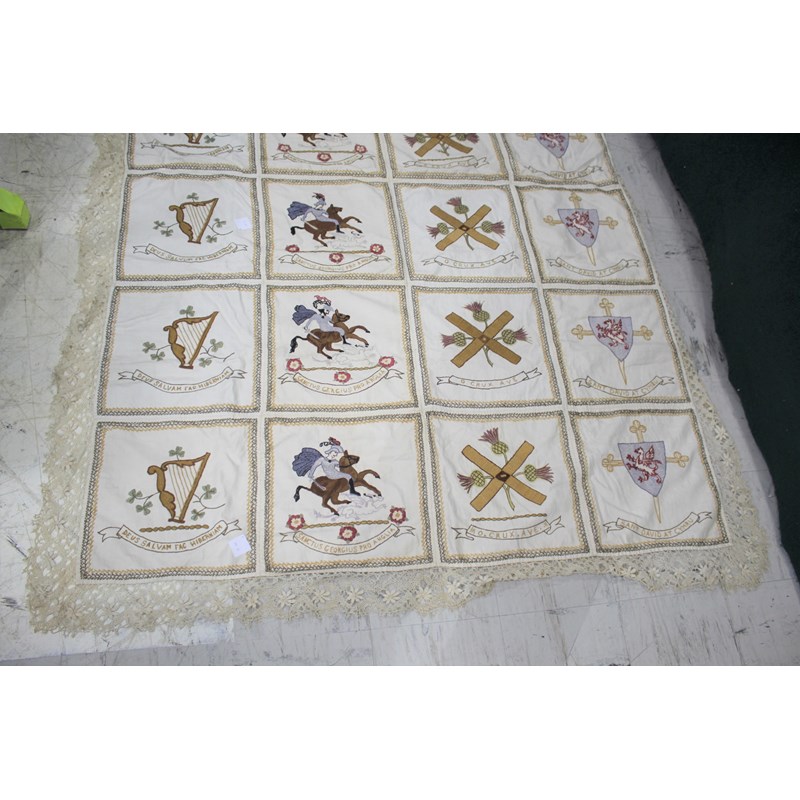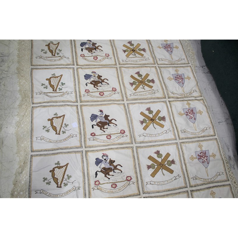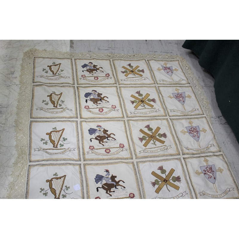 a cream embroidered patchwork style cover, edged with crochet lace and back with green silk. The panels with depictions of various nations (England, Wales, Ireland and Scotland).