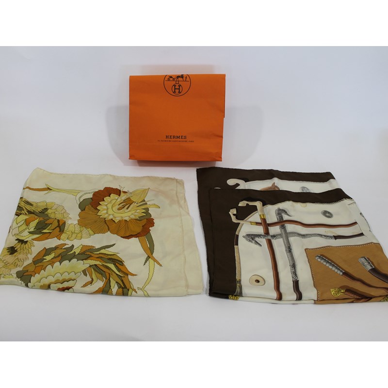 HERMES SCARVES a Hermes Tahiti silk scarf and a Cannes and Pommeaux Francoise De La Perriere Hermes scarf. Also with a Hermes bag. Some stains in places.