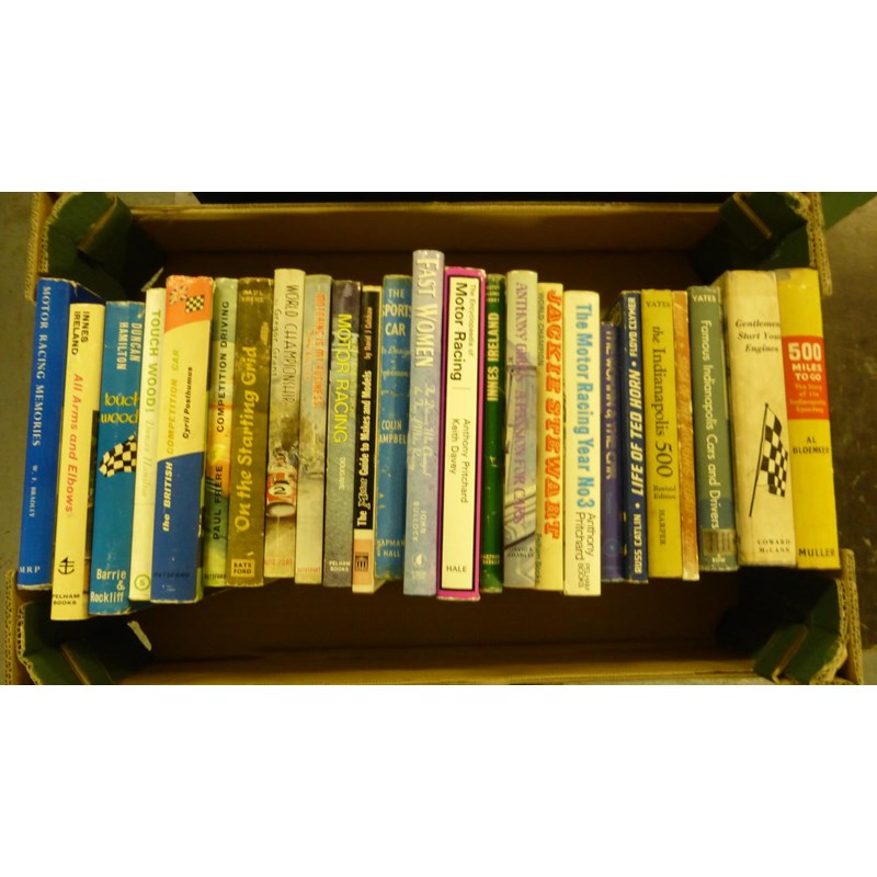 A box, to include: Motor Racing Memories by Bradley; All Arms & Elbows by Innes Ireland; On the Starting Grid by Paul Frere; The Sports Car by Colin Campbell; 500 Miles to Go by Al Bloemker; and many other good titles. (25)