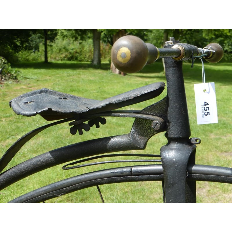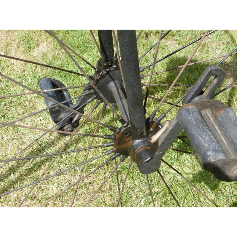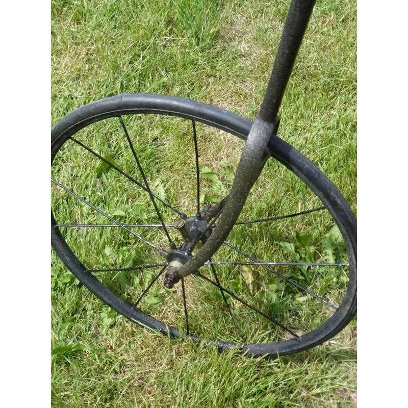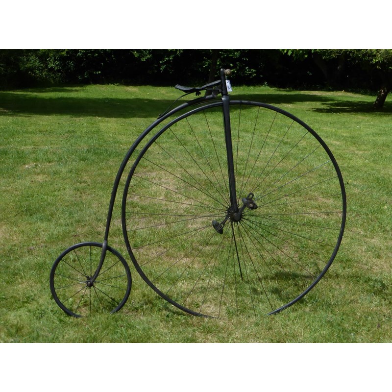 A c1878 W. H. J. Grout 'Tension' Bicycle. A 54-inch machine, having a Stanley patent headstock, 18-inch straight handlebars with patented twisting grip brake mechanism, original bone grips, saddle pan and patented Grout rear wheel bearings with a full array of brass cistern oilers. The circular section backbone carries a leaf spring saddle support. Each spoke is lock-nutted and the ¾-inch rims have black rubber tyring, the 20-inch trailing wheel is fitted to delightfully swept rear forks; original pedals come with this good and rare early machine.