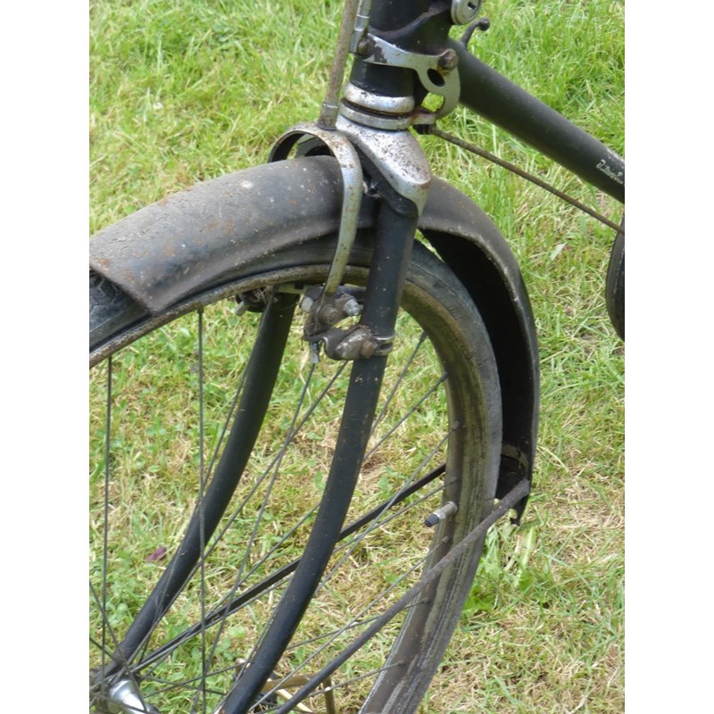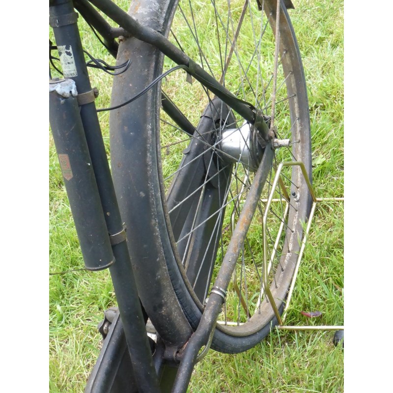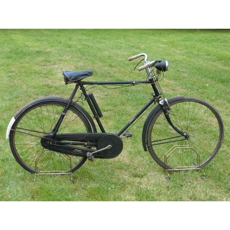 A 1950s Rudge Roadster having a 24-inch frame, Sturmey Archer three-speed dynamo rear hub, electric lighting, chain case, steering lock and semi-upturned 20-inch handlebars.