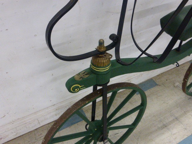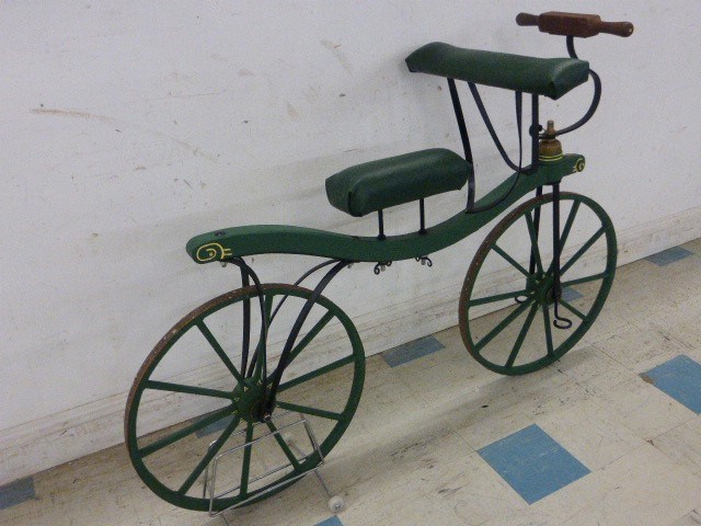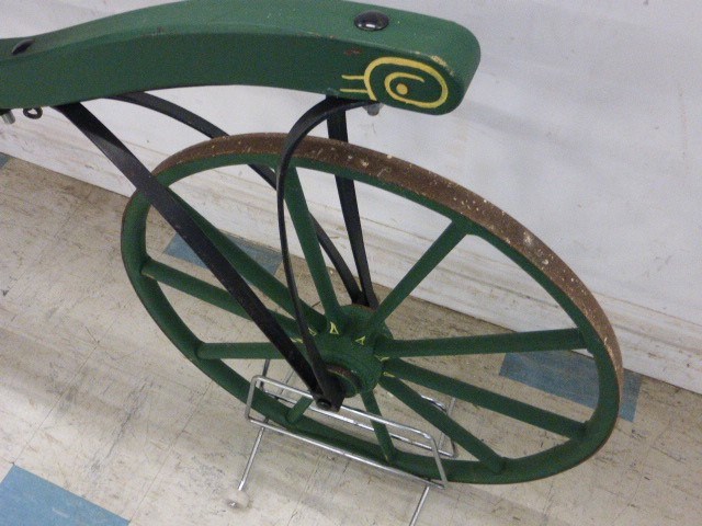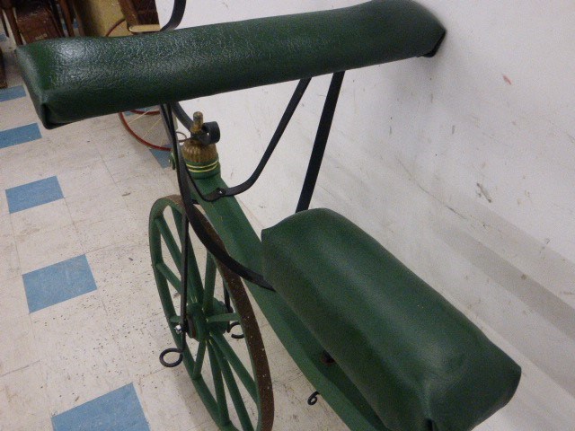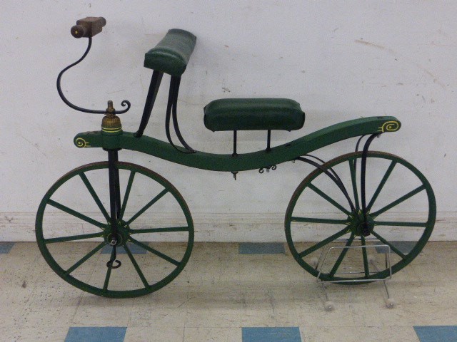 A reproduction Hobby Horse created in the style of a c1819 Denis Johnson type by Bill Haylor, having correct-style iron-work, correctly shaped backbone and arm rest, positive steering and period-style spoked wheels which are tight and iron-shod. Much enjoyed over the last ten-years, this highly useable machine is finished in Georgian green with brass fittings and with a comfortable 'saddle'; a pleasure to ride.