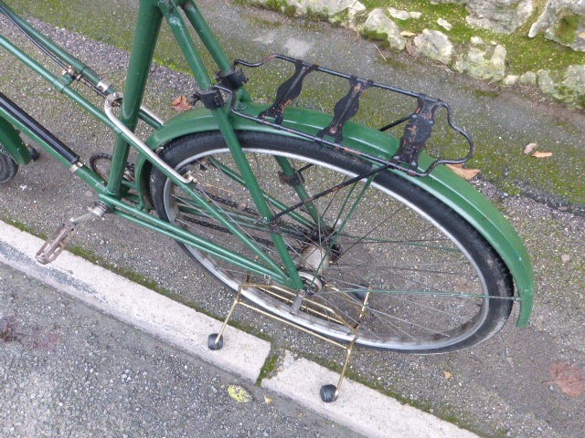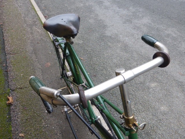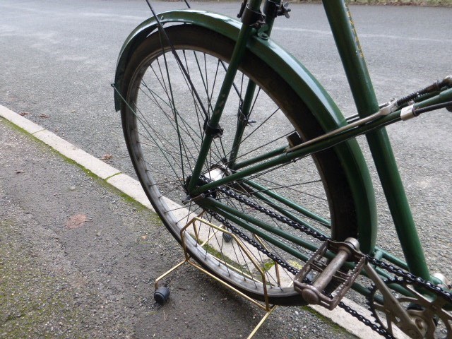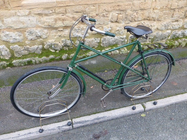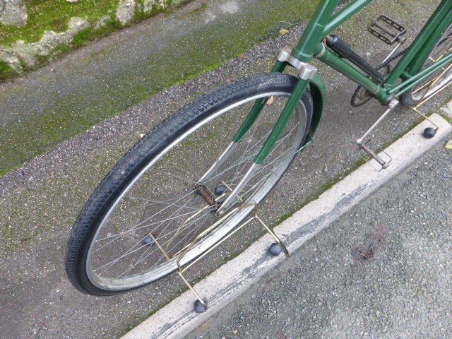 A quality 26-inch cross-frame bicycle with original 28-inch wheels, duplex front forks and mudguards. Also featured are rat-trap pedals, stirrup braking with Centaur's patented Bowden cable-operated rear brake, inverted brake levers, Brooks saddle, steering lock, 7-inch cranks and green enamel finish. A three-speed hub gear with a hand control on the 16-inch nickel-plated handlebars is fitted. At one time in the collection of the late Allan Hawkes, the VCC Centaur enthusiast, a very original and highly useable bicycle.