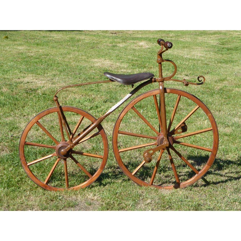 dating circa 1870, having a 24-inch wooden spoked driving wheel and a 20-inch rear wheel, both manufactured to pattern a number of years ago, together with a leather-topped saddle, triangular pedals, turned grips and brown enamel finish.