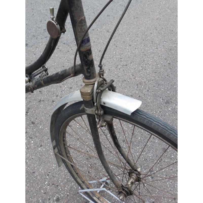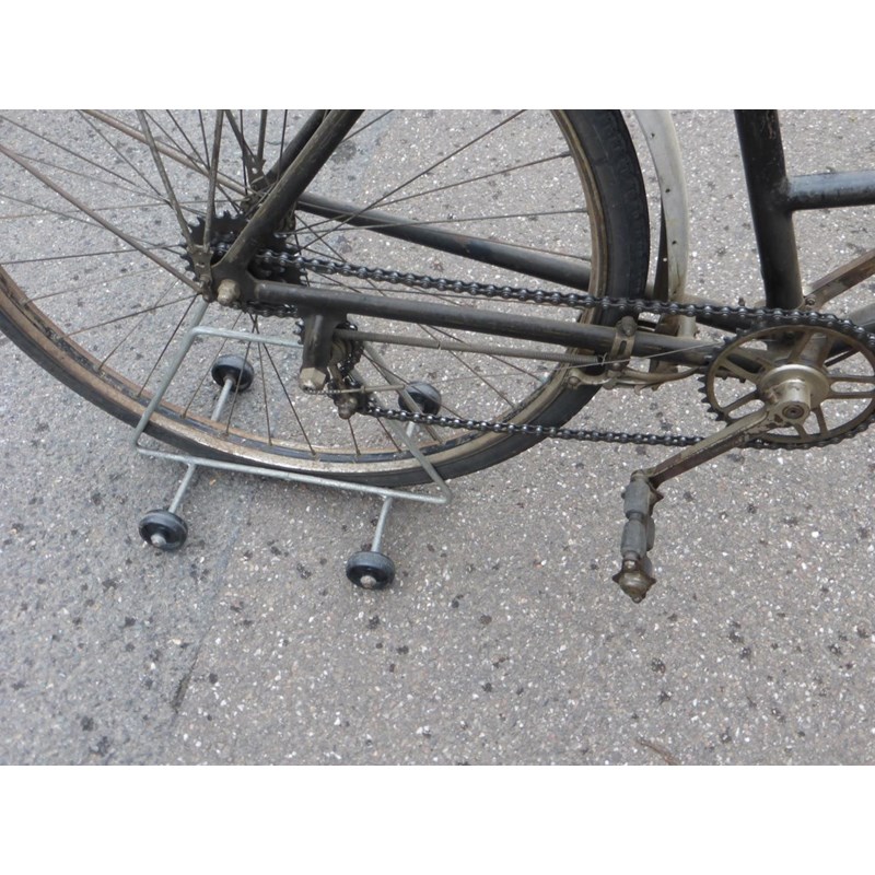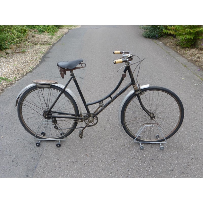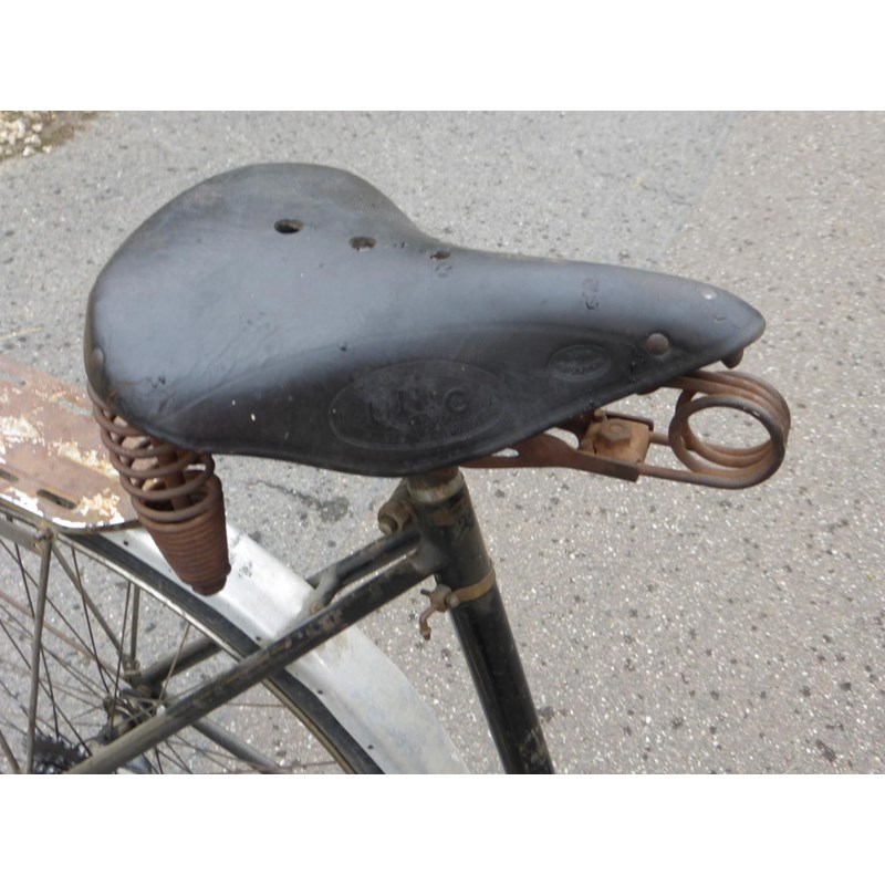 a quality French lady's bicycle with original black enamel finish with signs of lining, square section aluminium mudguards, centre pull and interestingly-designed calliper brakes operated by levers, flat 19-inch handlebars, split rubber block pedals, rear rack and distinctive of the maker who was a pioneer of Derailleur gearing, an original Le Chemineau three-speed Derailleur is fitted and controlled by a delightful lever system on the top tube. A rare original example of the marque. See also lot 484.