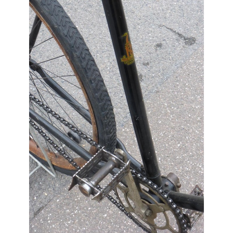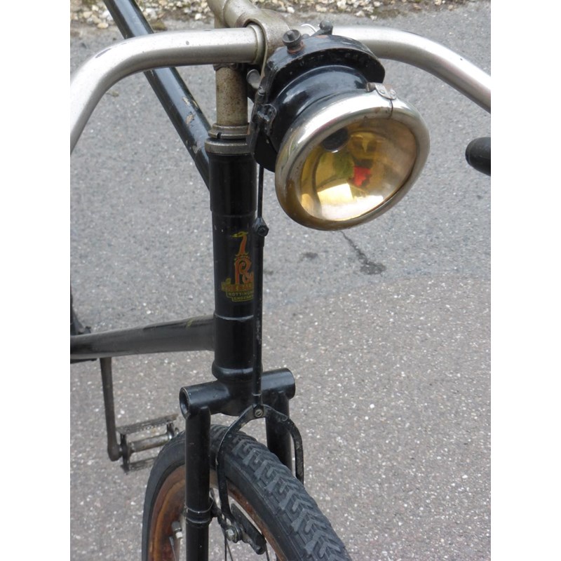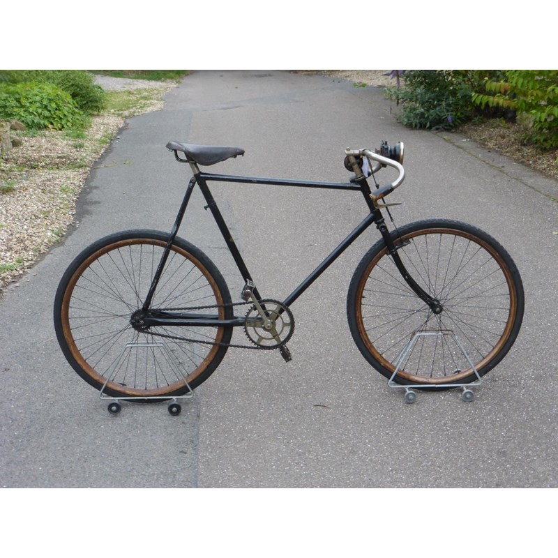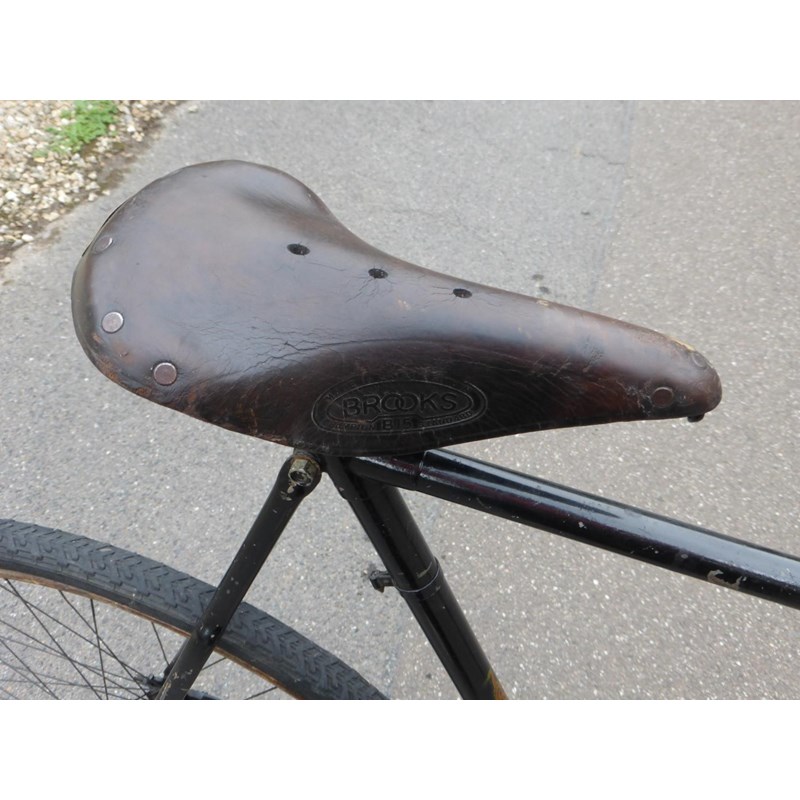 having a 24-inch frame numbered 336680, with a black email finish (possibly original) with logos and 'All Steel' motif. Nickel-plated semi-drop 20-inch handlebars, inverted lever operating a stirrup brake, fixed wheel gearing, tangent spoked wooded wheels and 26-inch Avon Cord tyres. A Brooks B15 saddle is fitted, as is an unusual lamp bracket designed for handlebars with a forward extension with a battery lamp and bell fitted.