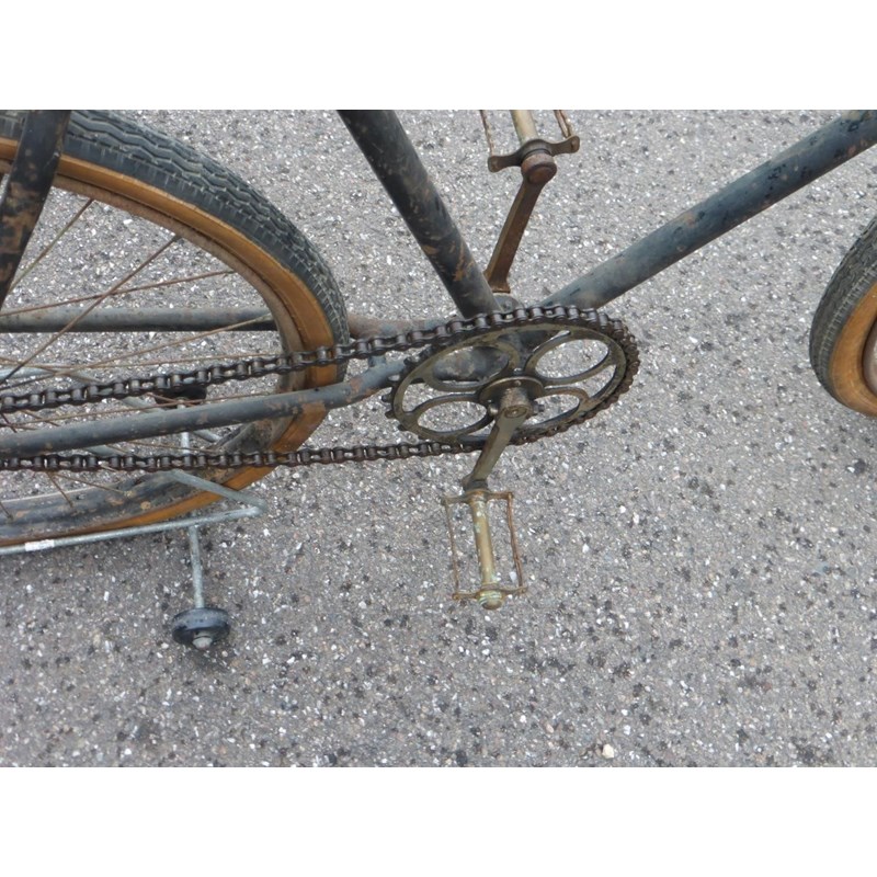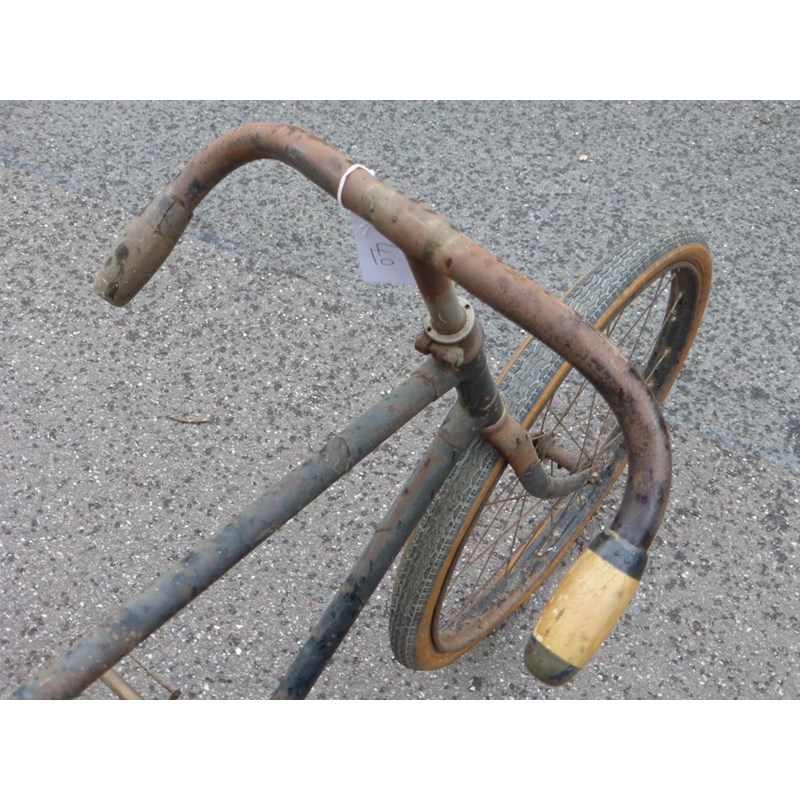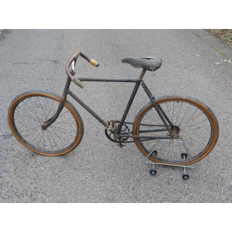 Just removed from storage, it has an 18-inch frame, 22-inch wheels, the front fitted into blind forks, inch-pitch double-roller chain operated by an interesting chain wheel design, fixed single gear and 14-inch swept handlebars with grips.