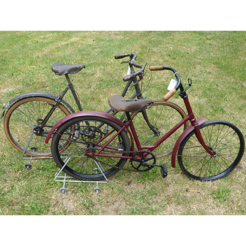 Dating from the 1920s, a very original machine with a 16-inch frame, cable brakes, shaped flat handlebars and leather saddle. Also, a braced strut framed dual-gender bicycle painted red with flat handlebars and turned grips and inch-pitch double-roller chain. Both in working order. (2)