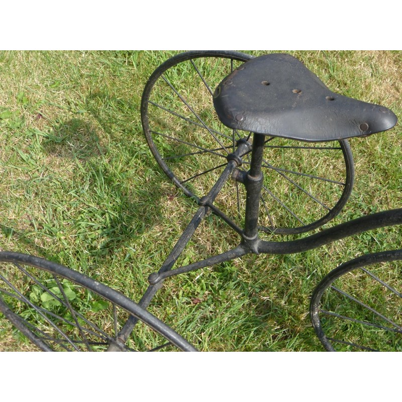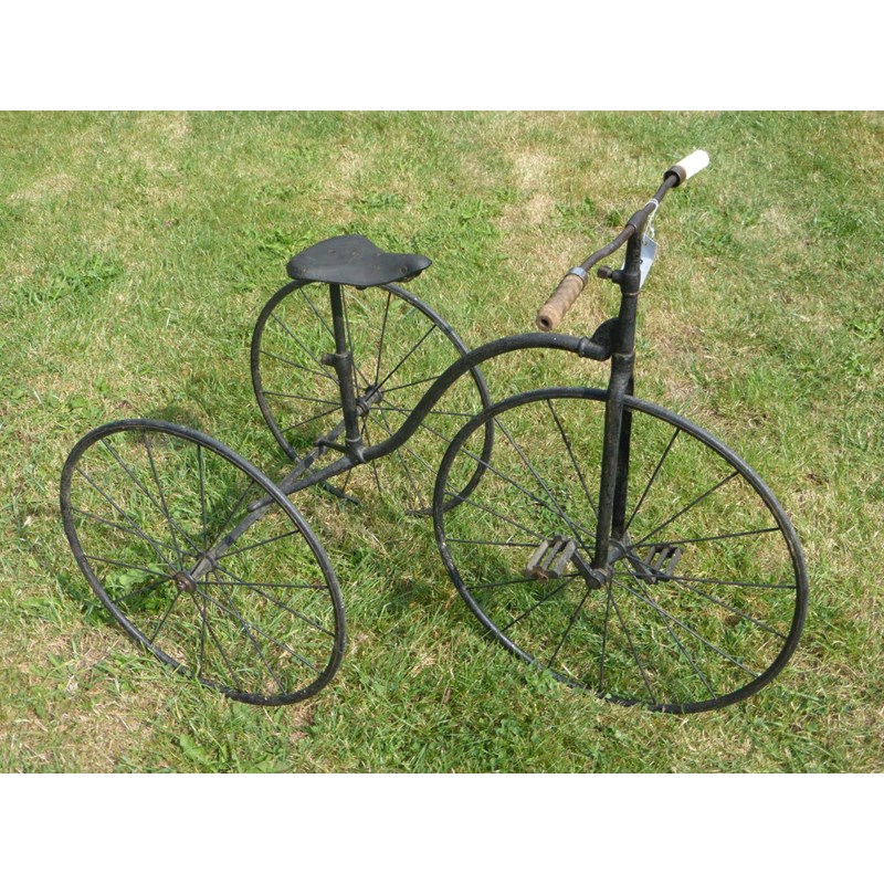 A Child's Tricycle. A good late Victorian tricycle by Hughes of Birmingham, with a steering and driving wheel of 23-inches, a steel frame, leather saddle and 20-inch rear wheels.