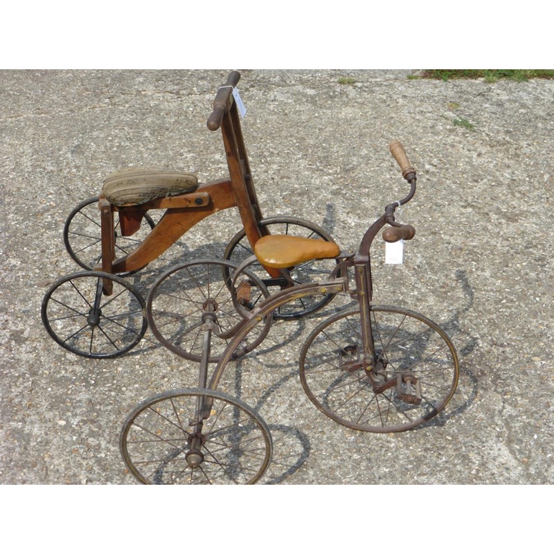 A good, late Victorian tricycle, with a steering and driving wheel of 14-inches, a steel frame, leather saddle, original lining and 12-inch rear wheels. Also, a 1930s wooden tricycle retailed by Hinder & Long. (2)