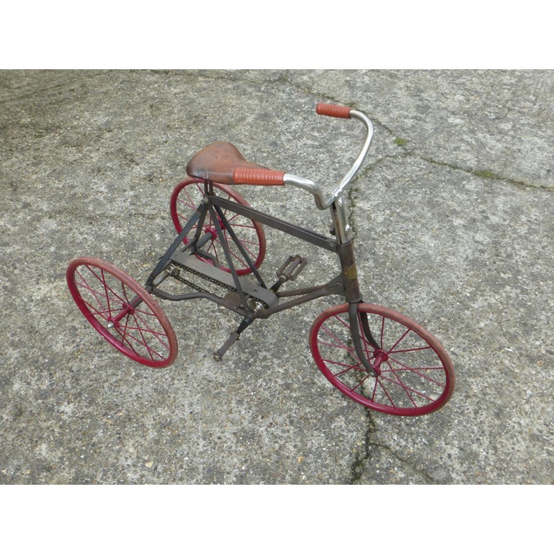 A C.K. Childs Tricycle. A quality machine manufactured by Collier and Keyworth in Massachusetts, USA. The C. K. Company was created in 1902. In good, original condition with red solid-tyring, dual-block inch-pitch driving chain, leather saddle and up-turned 15-inch handlebars.