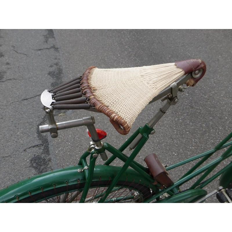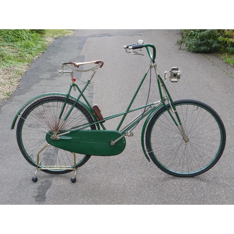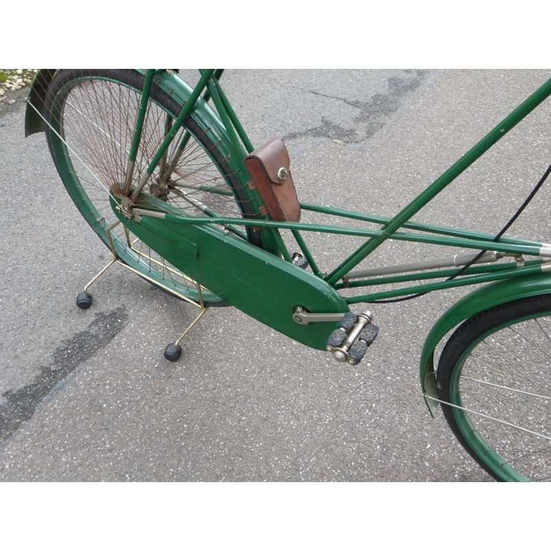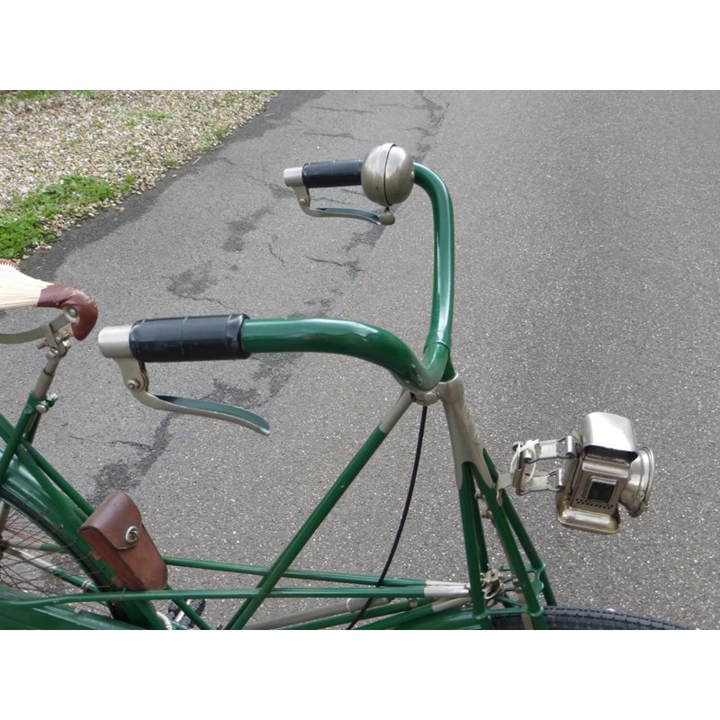 A size 'A' bicycle numbered 896?. Finished in green enamel with nickel-plated fork ends, 16-inch up-turned handlebars with inverted lever-operated stirrup brake and rear brake, celluloid grips, 26-inch Westwood rims and tyres, metal chain guard and a leather frame-fitted tool bag. The laced saddle has been rebuilt to original specification and Lucas double-ring bell and a nickel-plated 'Pathfinder' oil lamp is fitted.