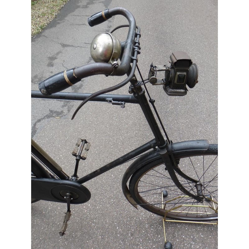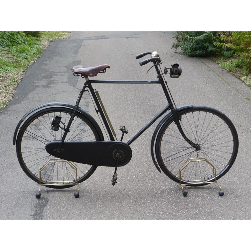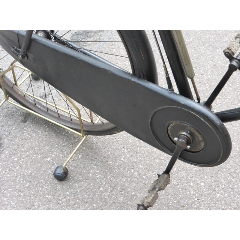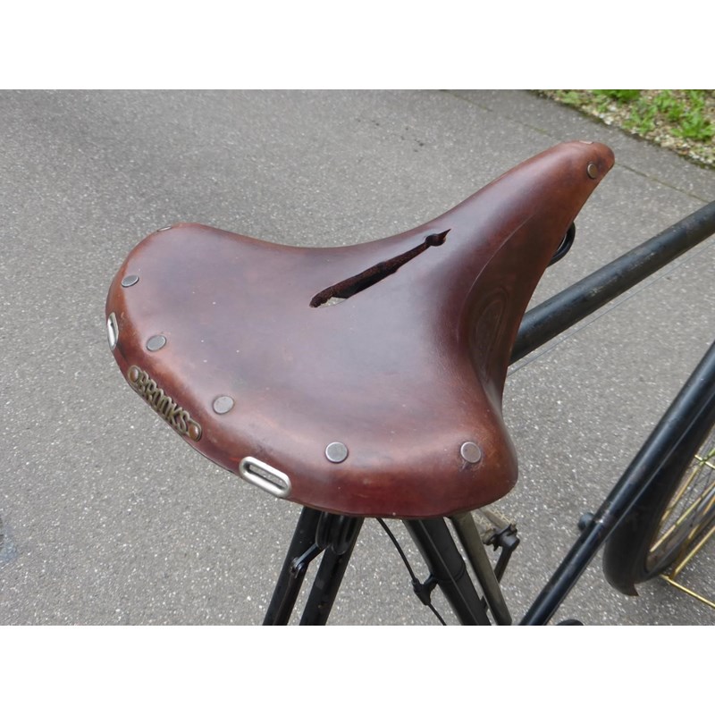A very original bicycle with a 26-inch frame number of 106252, with signs of its original gilt box lining, 28-inch wheels, roller lever-operated 'Sunbeam' patented brakes, leather saddle with a 'OO' Brooks badge on the rear, chain guard, steering lock and split rubber pedals. Offered with the machine are two celluloid handlebar inserts, the original caps replaced. A pair of front and rear oil-powered lamps and a Lucas bell are fitted.