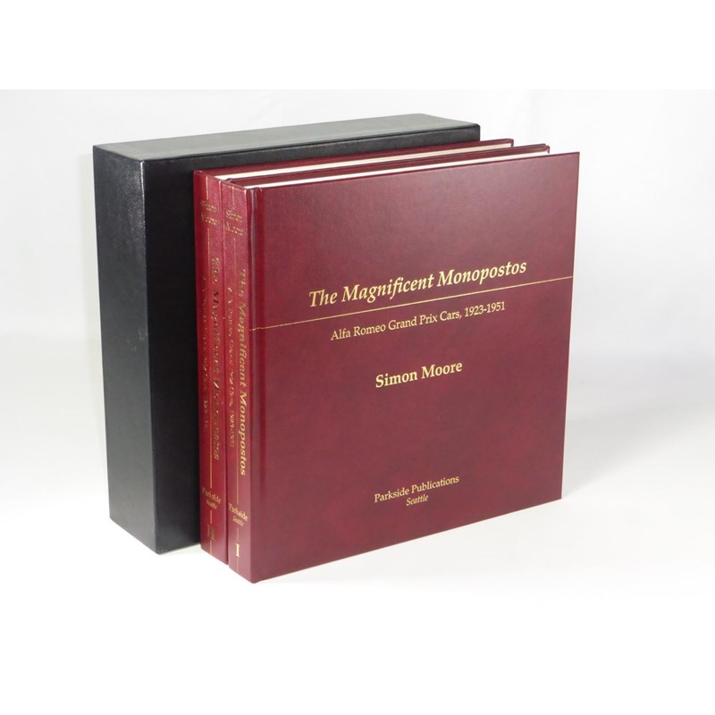 by Simon Moore. 886pp in two volumes with a black slipcase, published by Parkside, 2014. A limited edition of 1,000 published, edited and designed by Malcolm Harris. This is the third in a series of Alfa Romeo trilogies by the author, who had started this book with the intention of covering just the single seaters from 1931 to 1940, but uncovered so many previously unpublished photographs from the 1923 to 1930 period, that he decided to incorporate these years as well. The work was expanded further to cover the Tipo 158/9 until Alfa's retirement from Grand Prix racing in 1951. The pre-war racing history of the 158 cars in the voiturette category are also covered in detail. A large number of previously unpublished photographs cover the post-war period with technical detailed notes rather than covering each race singly, which had already been covered in previous books. The photographs are a delight and the text detailed and readable. In excellent condition.