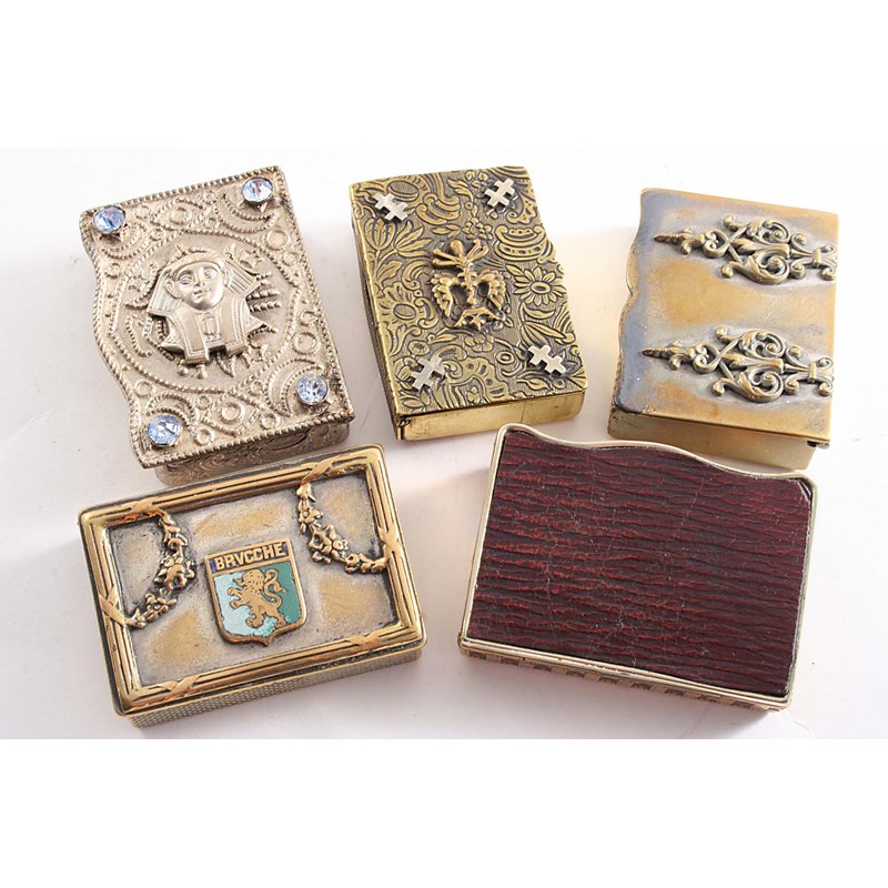 VARIOUS LATE 19TH / EARLY 20TH CENTURY FRENCH BRASS VESTA CASES, mixed designs; each approx. 1.9" (4.6 cms) long (5)
