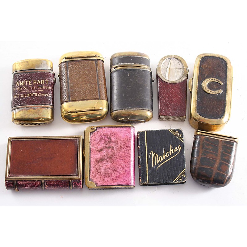 NINE VARIOUS BRASS & LEATHER BOUND VESTA CASES mainly early 20th century; the largest one 2.45" (6 cms) long (9)