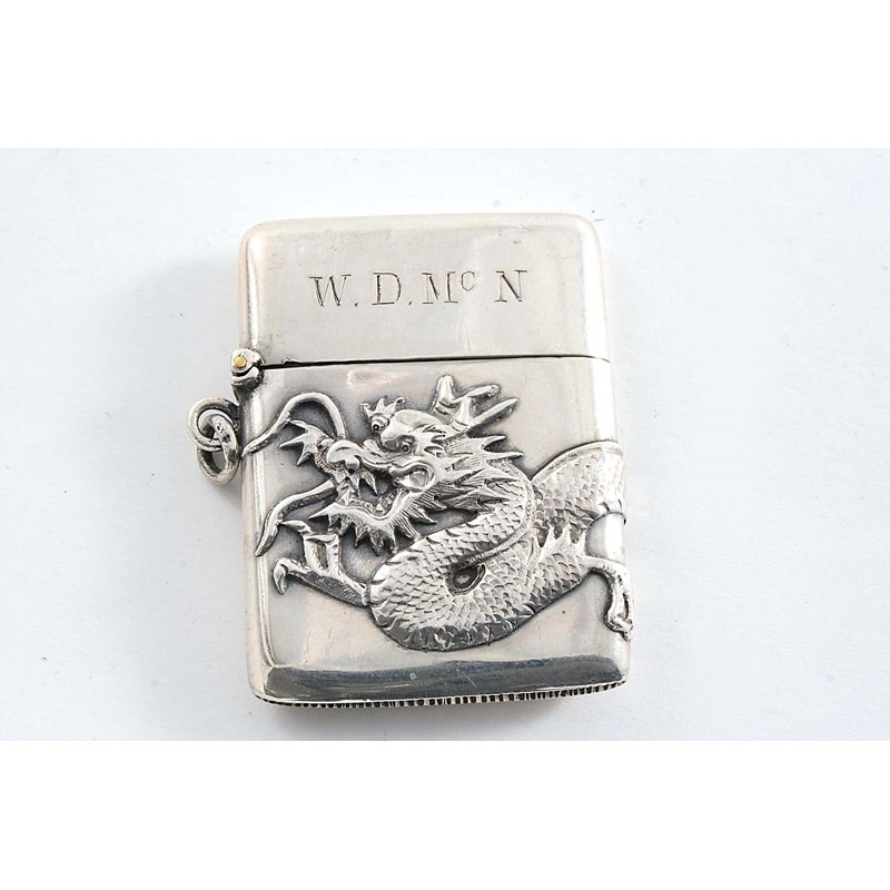 with an applied dragon & suspensory ring, initialled "WDMcN", maker's mark only, by Hung Chong of Canton & Shanghai 1910-20; 2" (5 cms) long; 1 oz