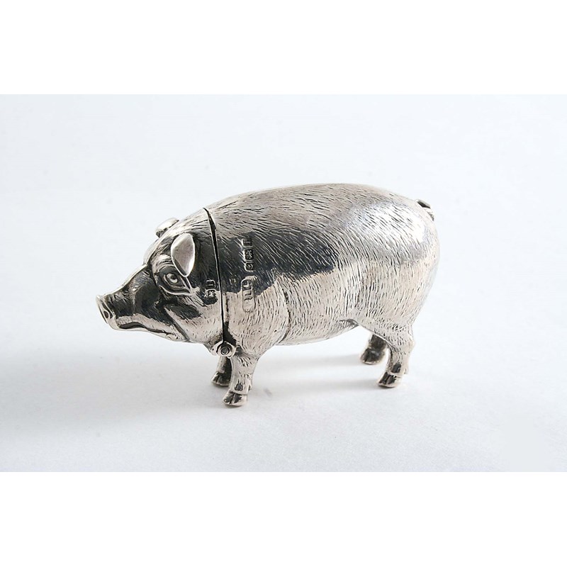 in the form of a standing pig with realistic detail & textured hair, gilt interior, by Adie & Lovekin Ltd., Birmingham 1908; 2.25" (5.5 cms) long; 0.6 oz