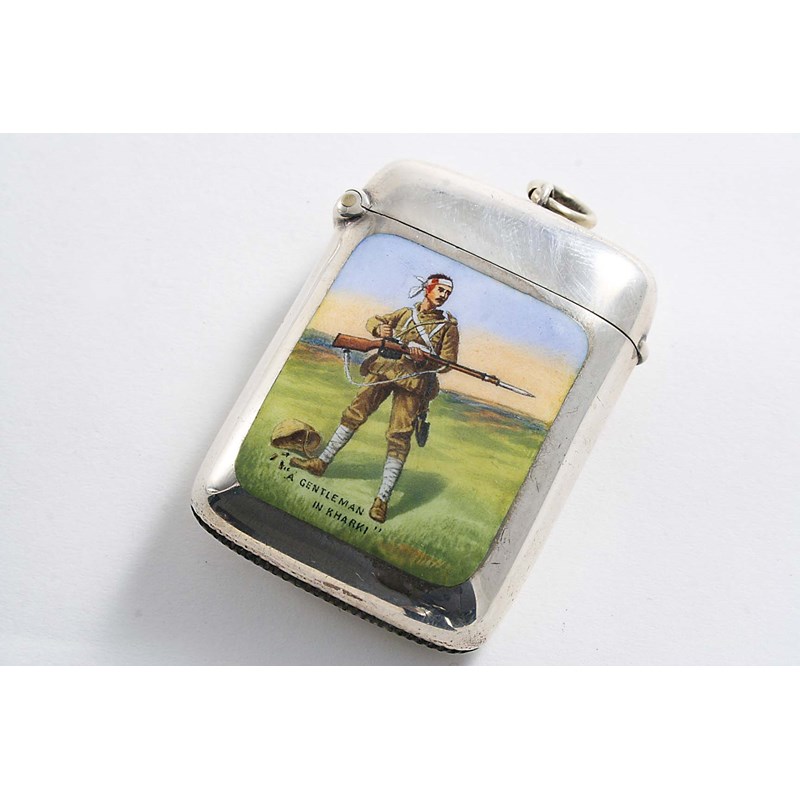 enamelled on the front with "a gentleman in khaki", suspensory ring, by C. Saunders & F. Shepherd, Birmingham 1899; 2.1" (5.2 cms) long; 1.1 oz