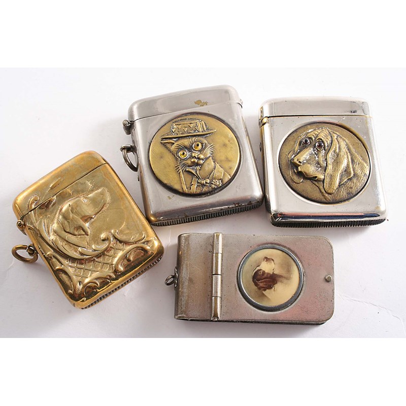 FOUR VARIOUS EARLY 20TH CENTURY PLATED/BRASS VESTA CASES with animal portraits; one with an amusing "cat in a hat", and the other three with dogs; the largest one 2" (5 cms) long (4)