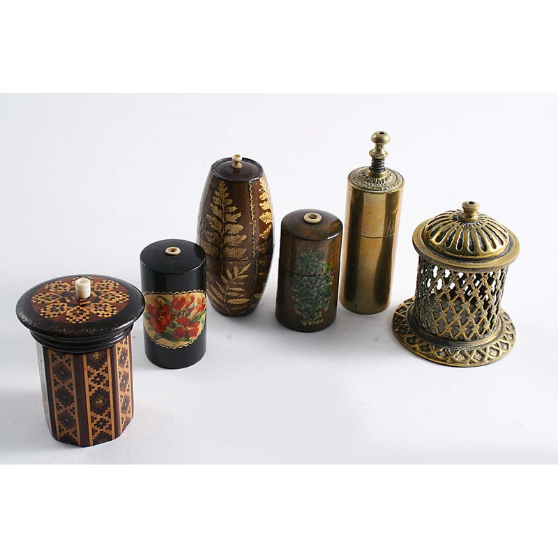 & five other "go to bed" vestas (two brass, one lacquered and two painted wooden examples); the largest one 3.3" (8.7 cms) high (6)