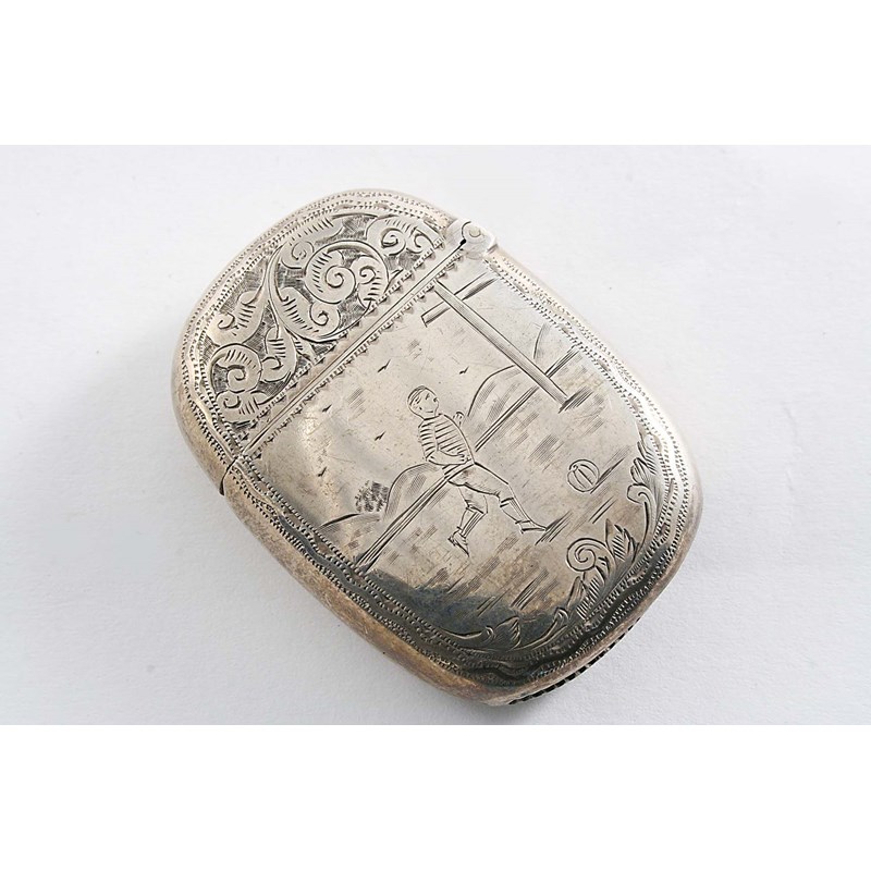 A LATE VICTORIAN ENGRAVED VESTA CASE of rounded oblong form with a footballer on the front, the reverse with scrollwork, gilt interior, by Messrs. Gammage, Birmingham 1892; 2" (5 cms) long; 0.83 oz
