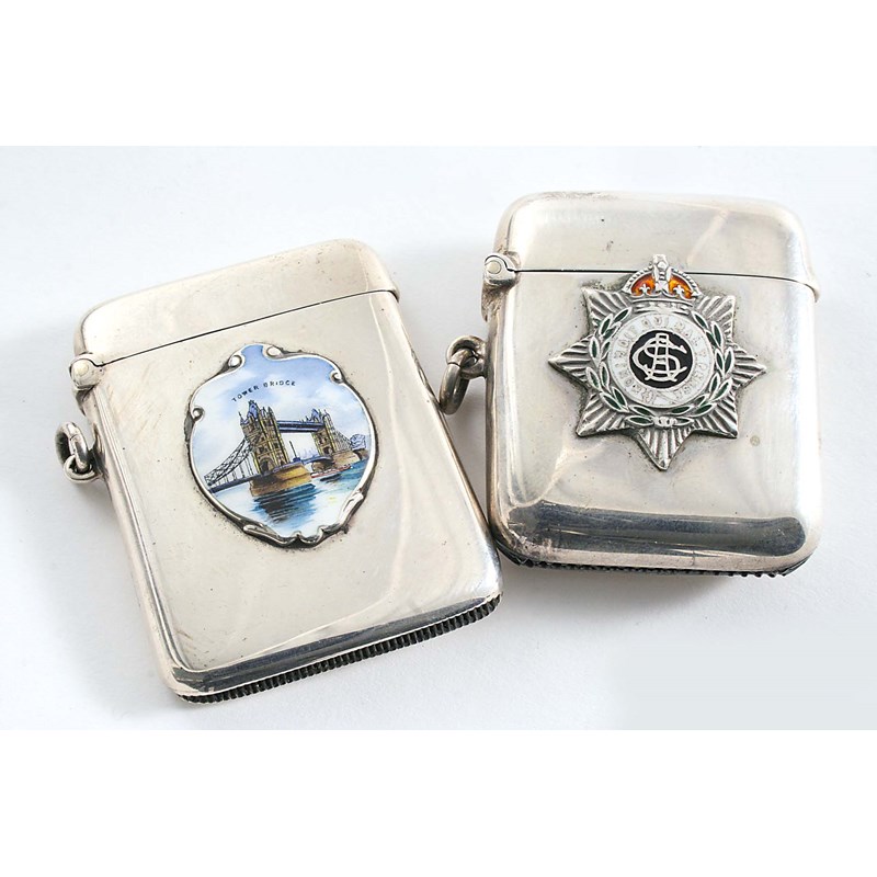 with a suspensory ring & an applied badge, the reverse inscribed, maker's mark "B&L", Birmingham 1915 and another with the applied enamel vignette depicting "Tower Bridge", the reverse monogrammed, maker's mark "R.C", Birmingham 1908; 1.75" (4.2 cms) long; 0.75 oz