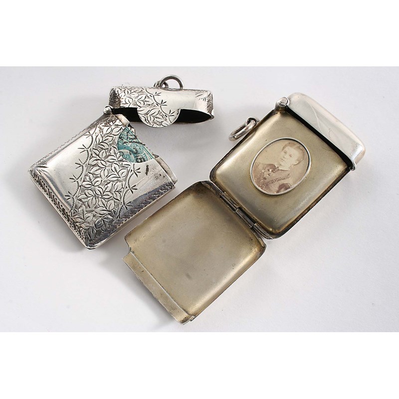 plain with a hinged front revealing a miniature photograph frame, gilt interior & suspensory ring, by H. Woodward & Co.Ltd., Birmingham 1904 and another vesta case with a stamp compartment, suspensory ring & Registered design no. "428374", maker's mark worn, Chester 1905; each one 1.9" (4.7 cms) long; 2 oz (2)