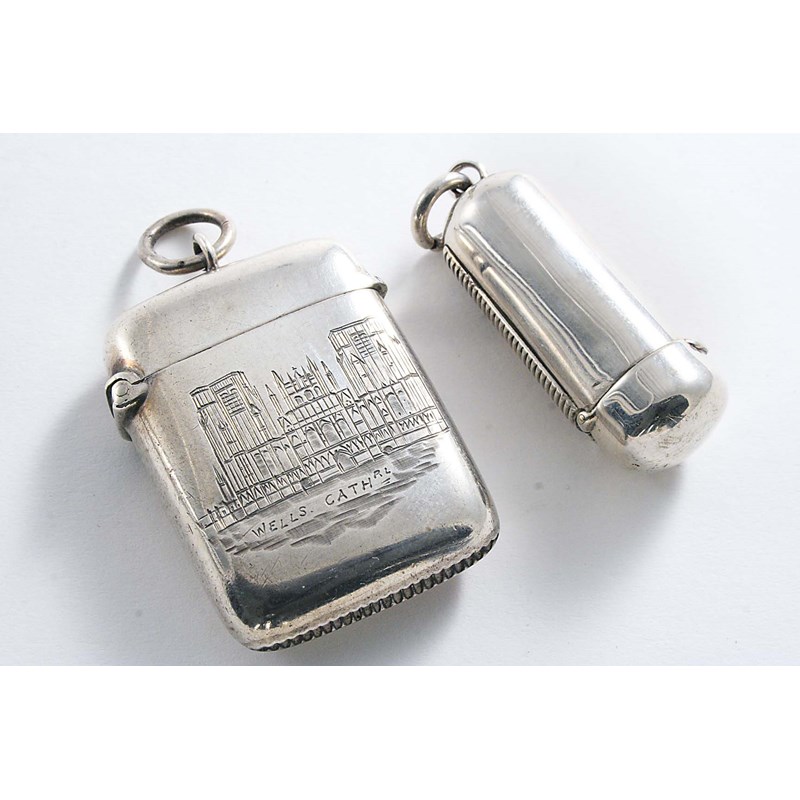 with an engraved view of "Wells Cathedral", in the front, suspensory ring, maker's mark worn, Birmingham 1896, and a small tubular vesta case, suspensory ring, gilt interior, by Randall Bros. Birmingham 1898; the latter 1.5" (3.8 cms) long; 0.9 oz (2)