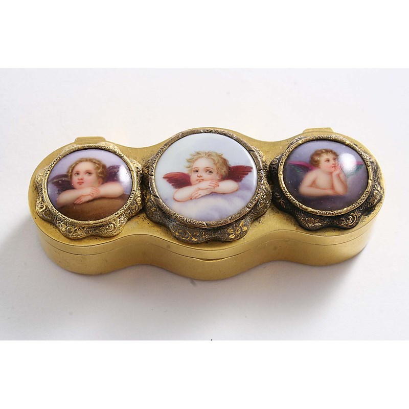 with a wavy outline, the cover set with three small porcelain plaques, each depicting a putto within a chased mount, the base ridged for striking, unmarked c.1870; 3" (7.6 cms) long
