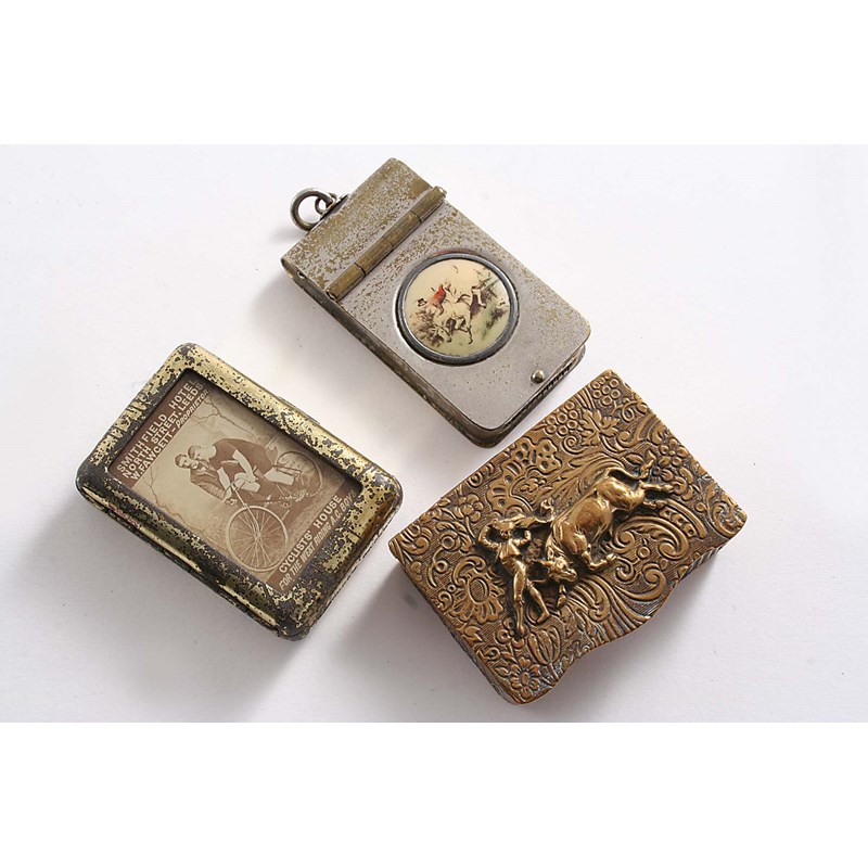 AN EARLY 20TH CENTURY BRASS VESTA CASE with a bullfighter in relief on the cover and two other plated vesta cases; the former 1.9" (4.8 cms) long (3)
