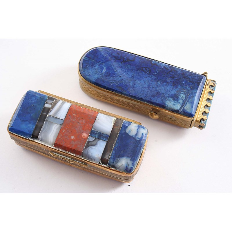 with a flip cover, and another gilt-metal vesta box with an agate base and a multicoloured agate cover; the latter 2.5" (6.3 cms) long (2)