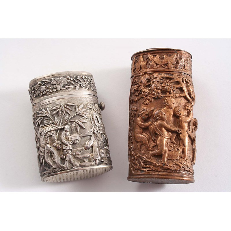 of oval cylindrical form with figures in a native landscape & fruiting vines in relief, button catch, and character maker's mark in the cover (lacking spring), c.1875 and a copper vesta case with relief decoration, c.1890; the latter 2.5" (6.5 cms) long; 0.9 oz weighable silver (2)