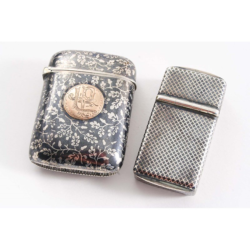 A SMALL 19TH CENTURY FRENCH NIELLOWORK VESTA & TINDER BOX COMBINED, gilt interior, c.1860 and a niellowork vesta case with applied gold cartouche, monogrammed, unmarked c.1900; the latter 1.75" (4.5 cms) long; 1.4 oz (2)
