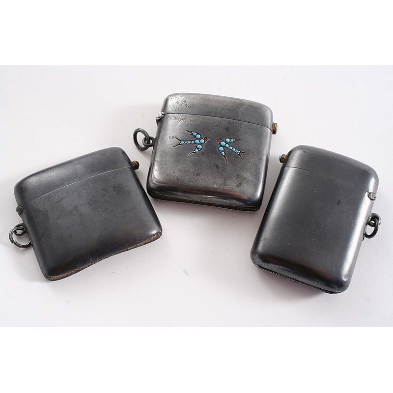 with a gem-set thumbpiece, another gun-metal vesta with turquoise-set swallows on the front and another plain gun-metal example, all with suspensory rings, all dating from 1895-1900; the largest one 2" (5 cms) long (3)