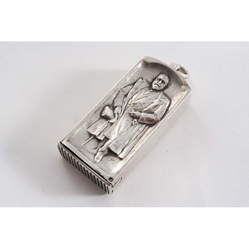 with an arched top & a suspensory ring, sculpted with the recessed figure of a portly gentleman holding a top hat, signed "PH" for Percival Hedley (with copyright protection), by Frederick Price, London 1909; 1.75" (4.5 cms) long 0.4 oz
